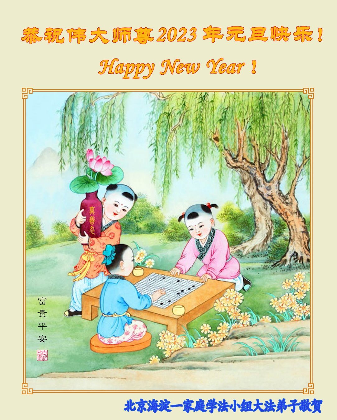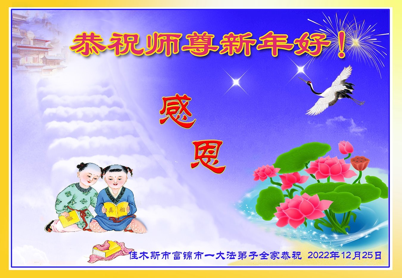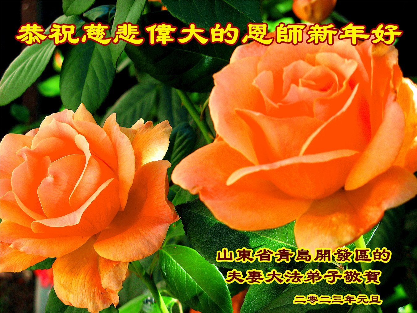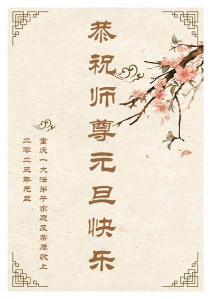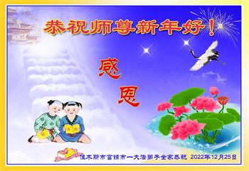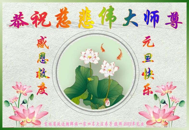 【明慧网二零二二年十二月三十一日】(明慧网通讯员综合报道)2023年元旦来临,在法轮大法中受益的世人和大法弟子家族成员纷纷来信表达对李洪志师尊的问候与感恩,敬祝李大师新年好!