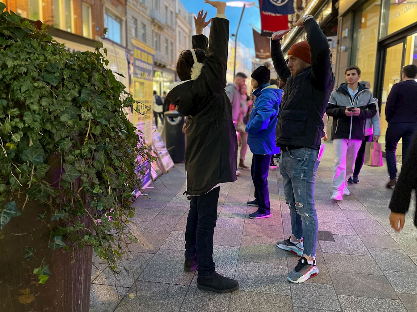 学员们在音乐中演示功法,他们优美祥和的炼功动作吸引了中年男子约纳特(Ionut),他正从真相点后侧经过。站住后他静静地看了一会儿,也抬起手,模仿起学员的动作。