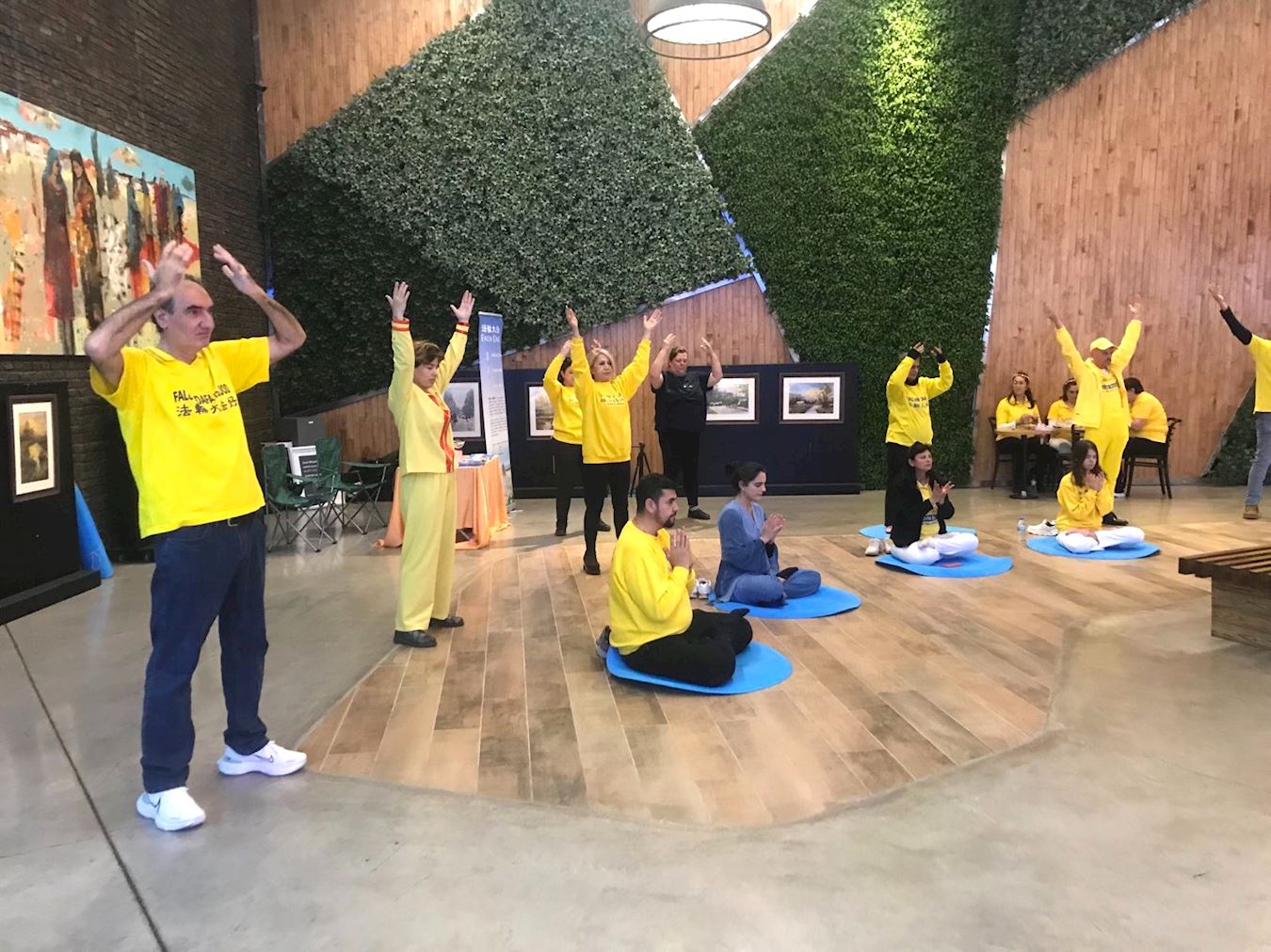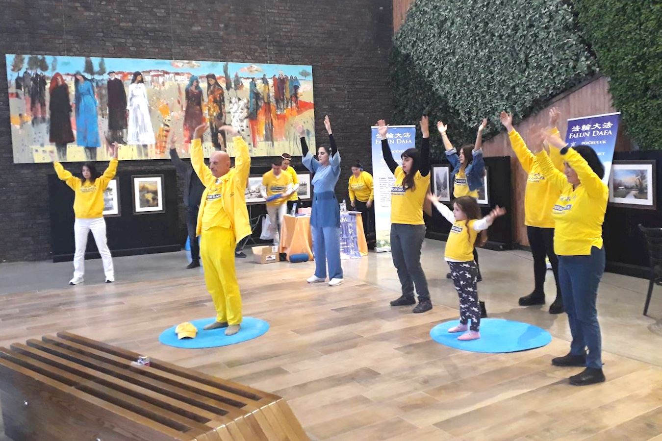 活动期间,学员们伴随着优美的炼功音乐展示法轮功功法,还有的学员表演了莲花舞。法轮功学员的活动吸引了很多人前来学功。
