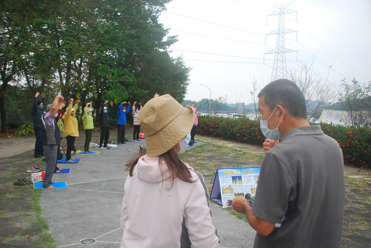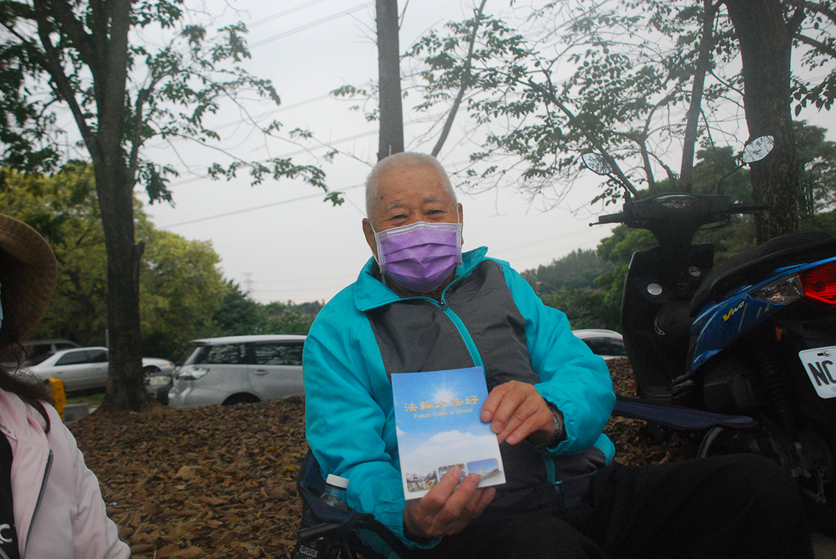 住嘉义县中埔乡八十六岁的马先生,年轻时做生意,平常练气功,他说因为大陆不能炼法轮功,今天“看到学员炼功的场景,感到很祥和平静”。学员告诉他:“中共是西来邪灵,主张无神论,法轮功是正法,邪不胜正,中国人不等于中共。”马先生捧着真相资料,明了的点着头表示赞同。