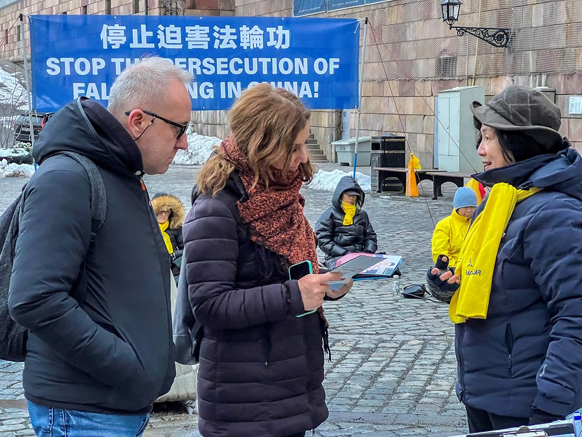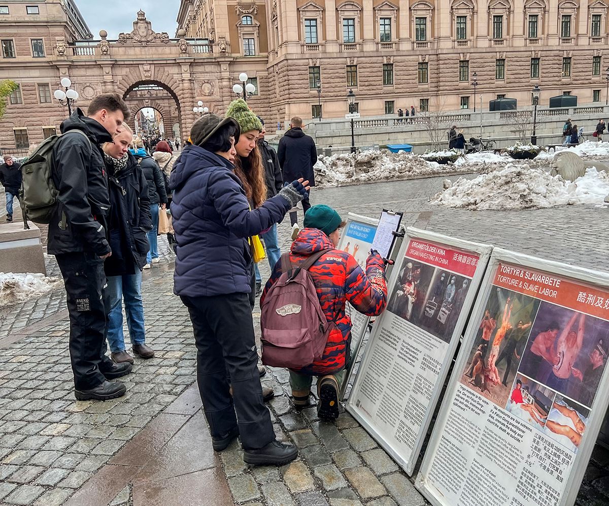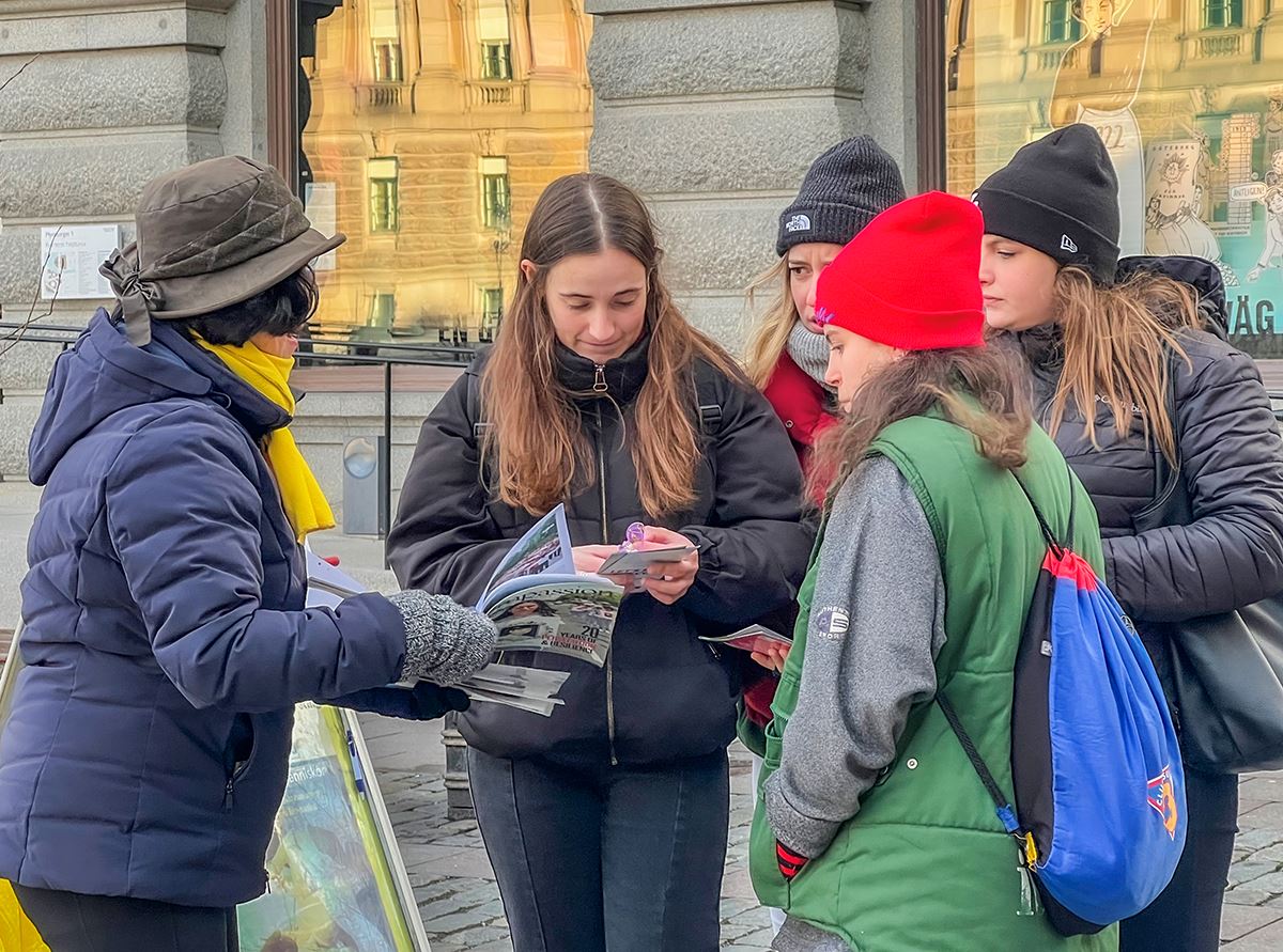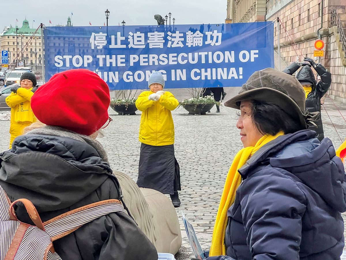钱币广场是通往斯德哥尔摩老城、皇宫的必经之路。活动现场醒目的横幅、真相展板,以及学员们宁静祥和的炼功场面,吸引着来来往往的人们驻足,了解真相、签字支持,还有不少人表示对功法很感兴趣。