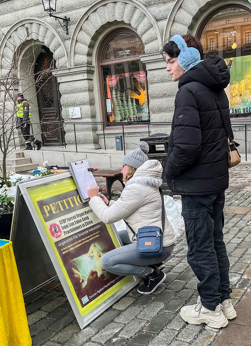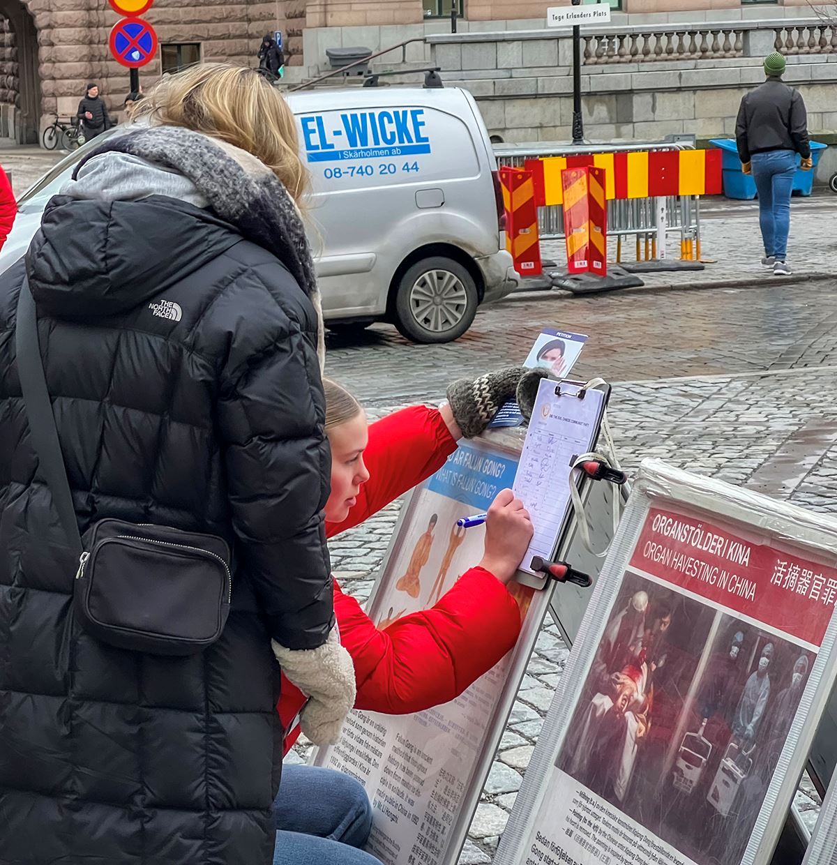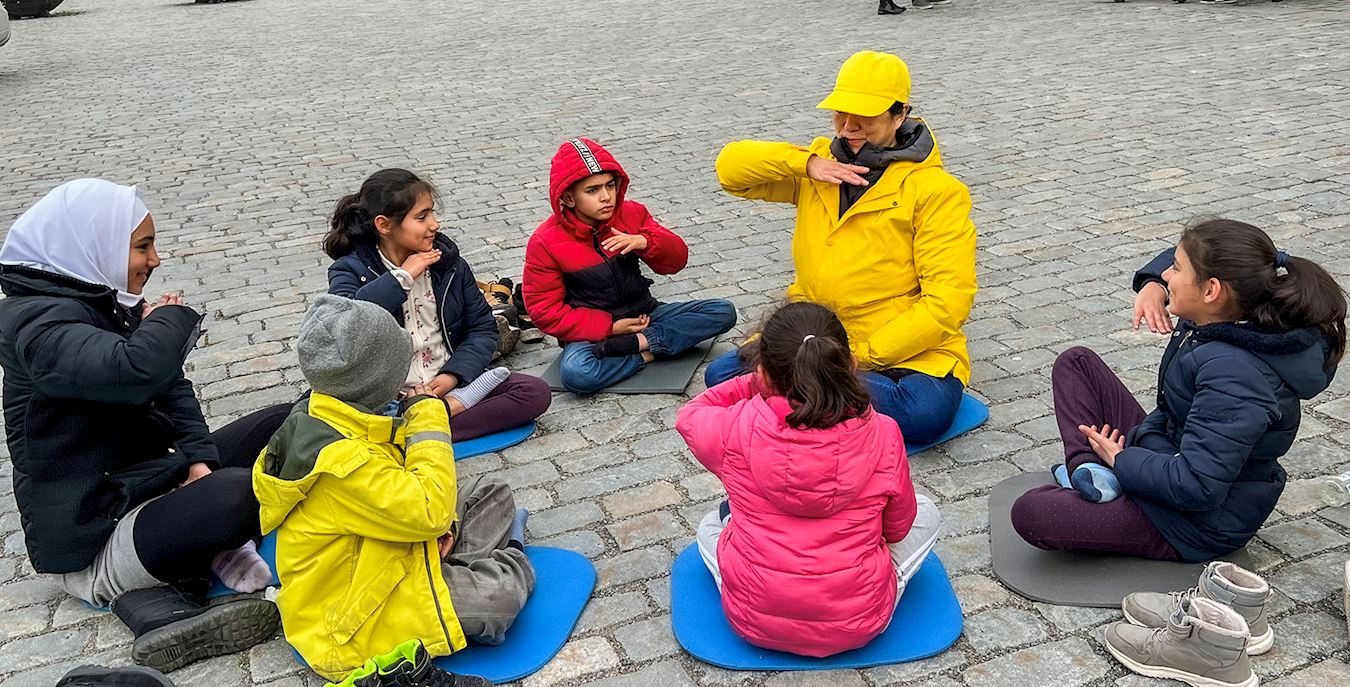 钱币广场是通往斯德哥尔摩老城、皇宫的必经之路。活动现场醒目的横幅、真相展板,以及学员们宁静祥和的炼功场面,吸引着来来往往的人们驻足,了解真相、签字支持,还有不少人表示对功法很感兴趣。