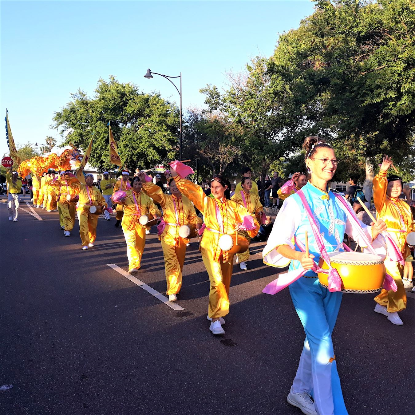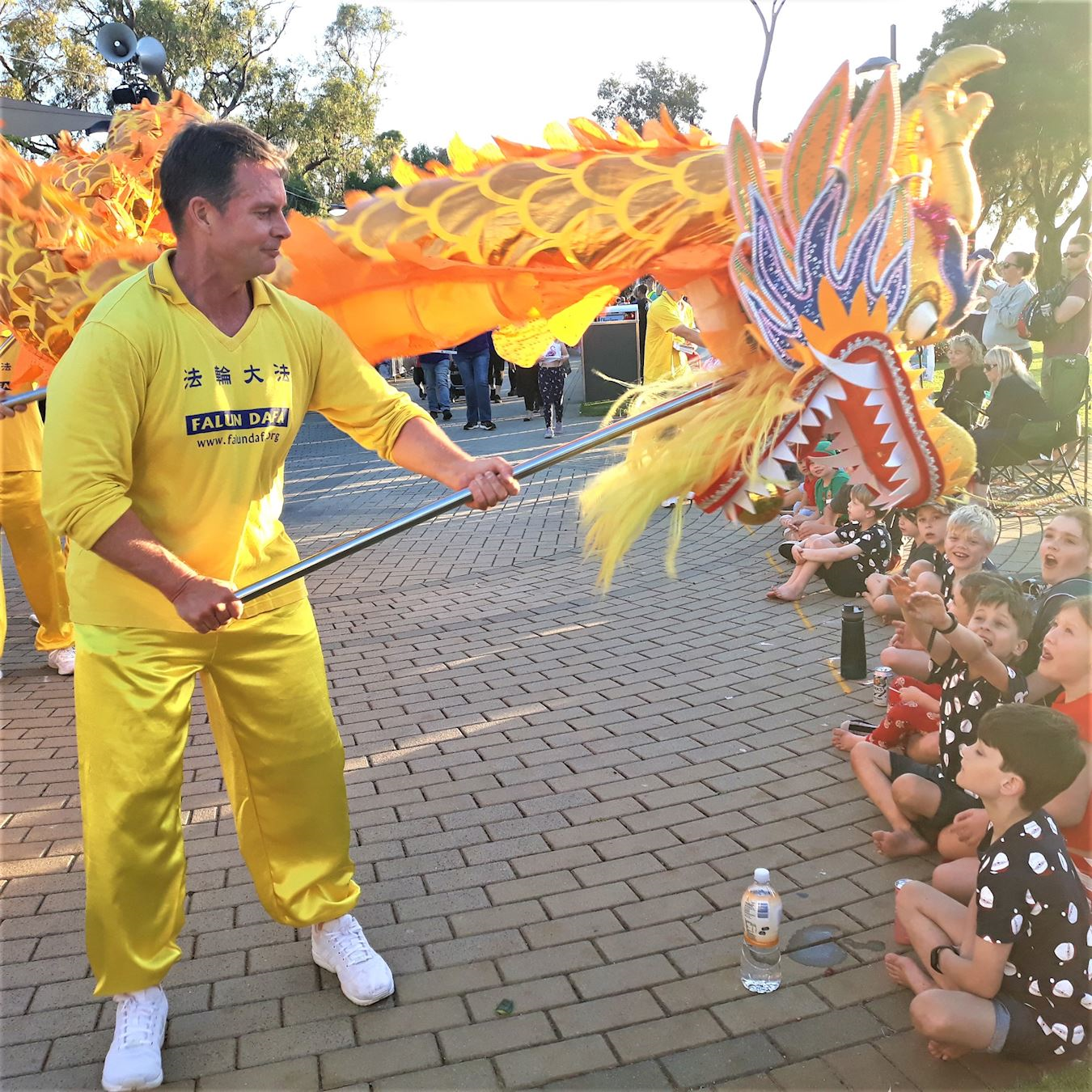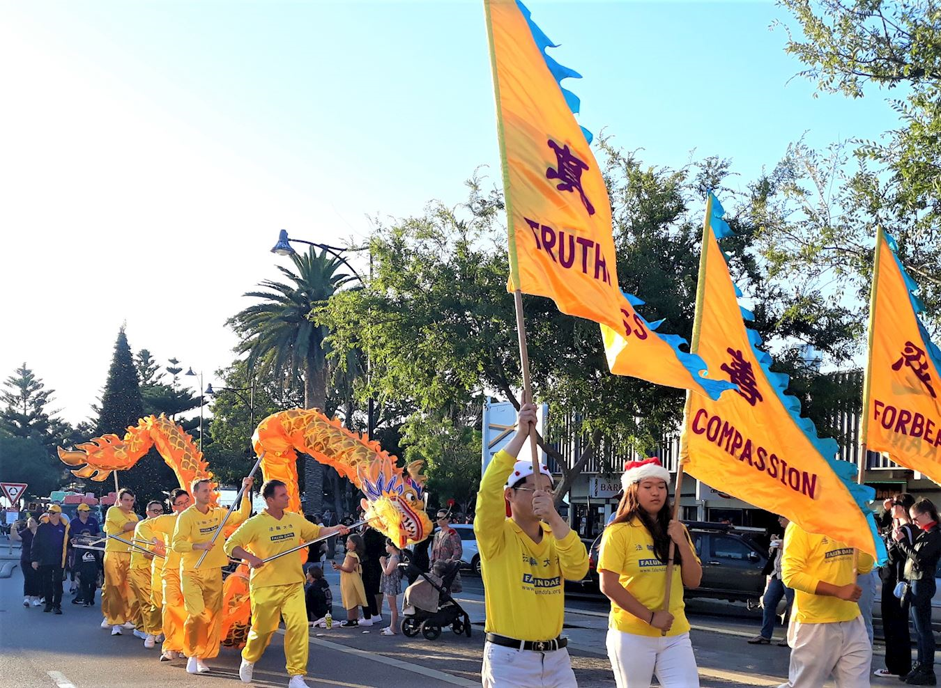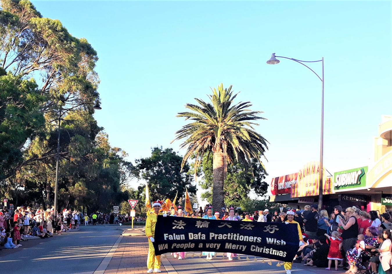 法轮功学员韦伯斯特(Michele Webster)说:“法轮大法教导我们真、善、忍,这是美好纯净的品德和价值观,相信所有人都会接受他。作为法轮功学员,我们希望通过参加圣诞游行,来展示法轮大法修炼之美,并为大家带来圣诞祝福,希望我们的腰鼓和舞龙表演,能为圣诞游行带来光明和活力。我们的横幅上写着:‘法轮功学员祝愿西澳人民圣诞快乐’,我们还有三个人举着真、善、忍的幡旗,飘扬的幡旗,让人们看到这些美好的价值观。”