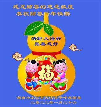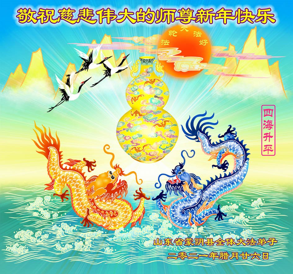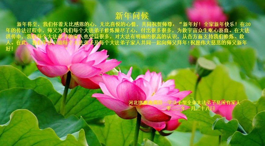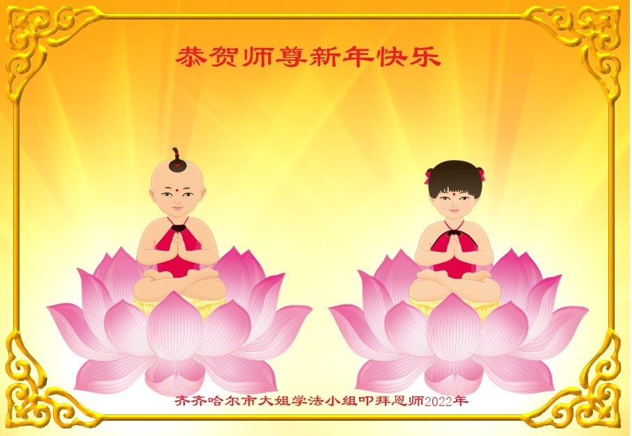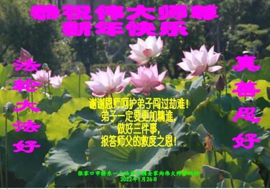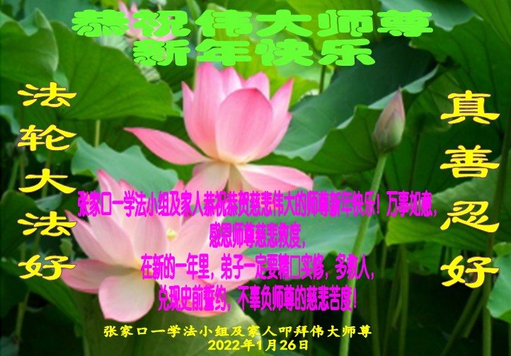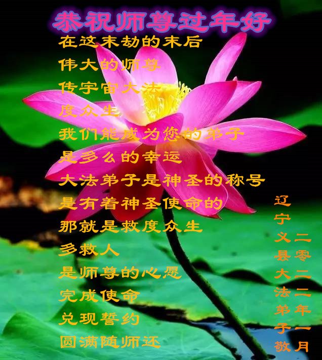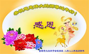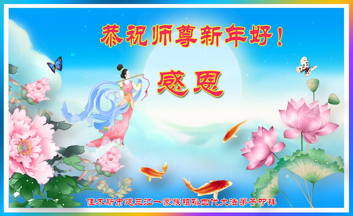 【明慧网二零二二年二月一日】法轮飞旋,光阴如梭,洪贯全天体的正法洪势迅不可挡,已向法正人间过渡。遍布世界的法轮大法弟子与得到大法福报的众生都真切感受到了大法的威力、慈悲和殊圣。在这辞旧迎新的传统新年,各国大法弟子恭祝师父新年好!虔诚感恩师尊的慈悲看护,庆幸得到这万年难遇的圣缘,在转瞬即逝的正法修炼路上弟子们将精進不怠。