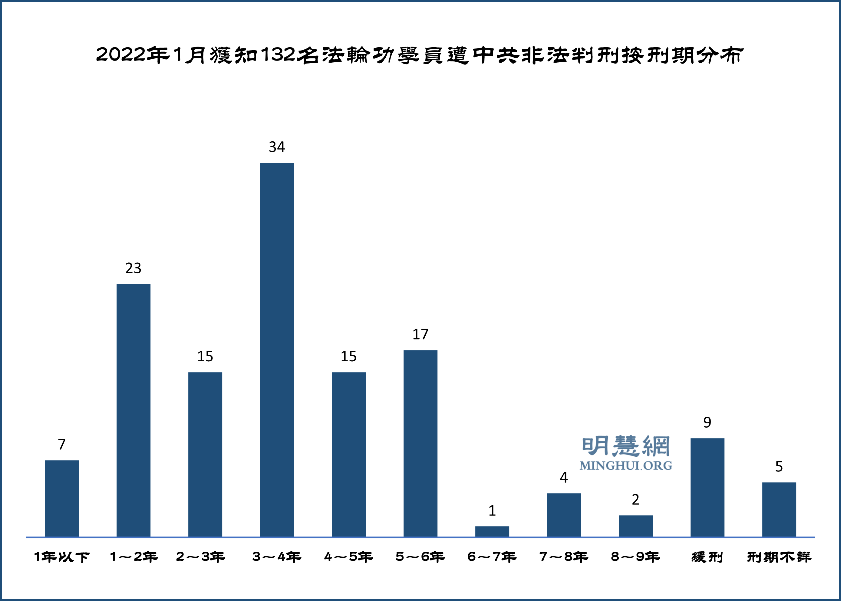 ![]() 图1:2022年1月获知132名法轮功学员遭中共非法判刑按刑期分布 |