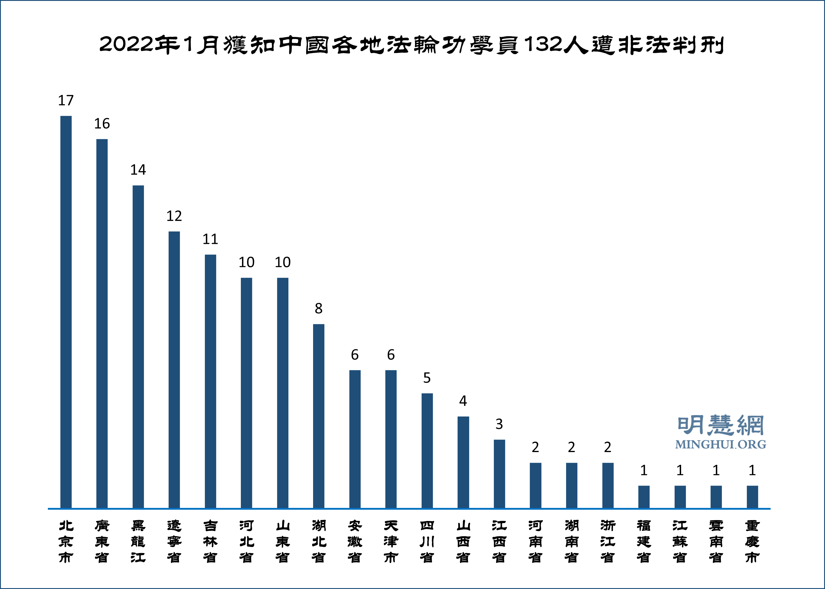 ![]() 图2:2022年1月获知中国各地法轮功学员132人遭非法判刑 |