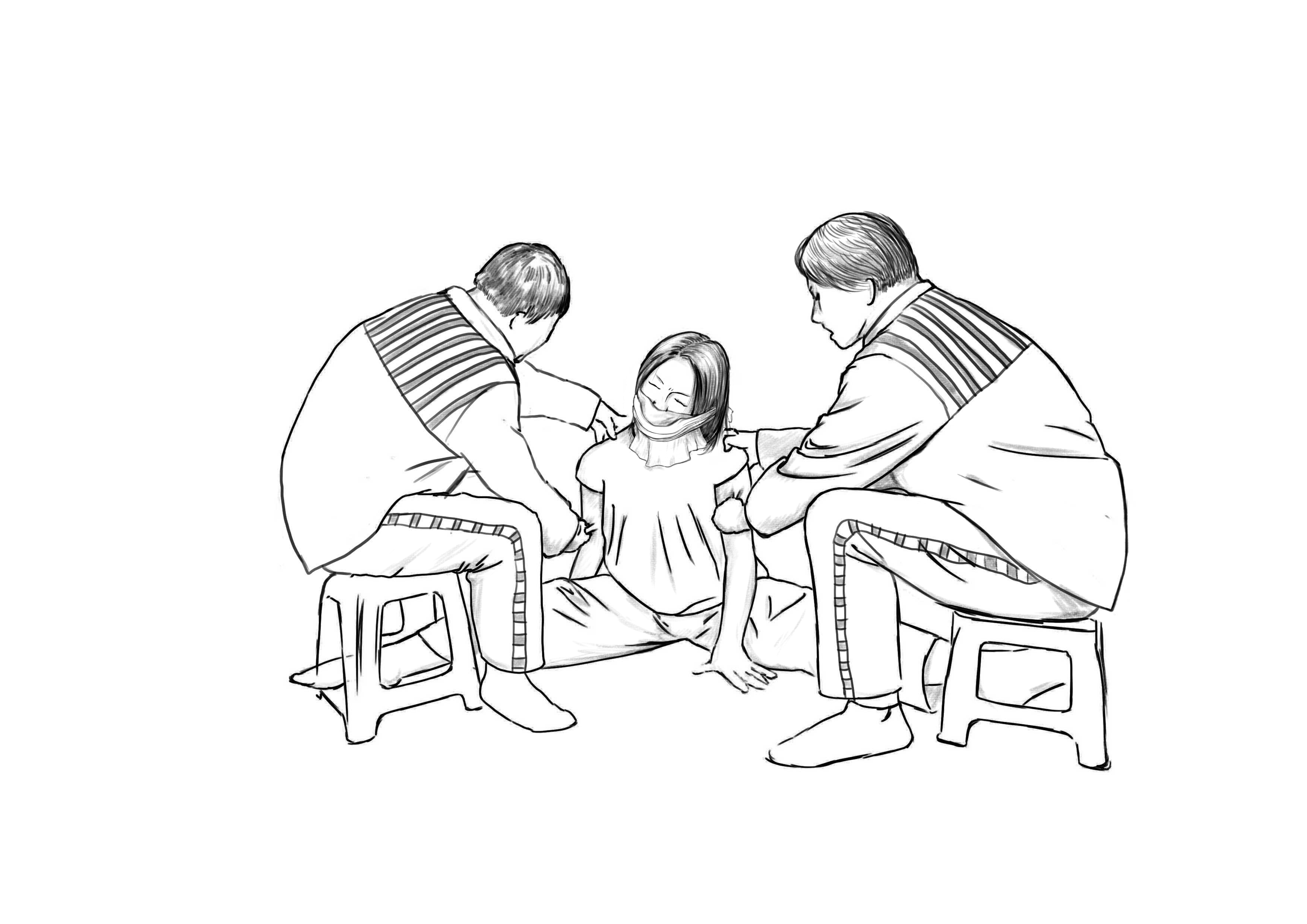 ![]() 酷刑示意图二:用抹布堵嘴,用毛巾把口蒙住,再用毛巾左右使劲拧头。 |