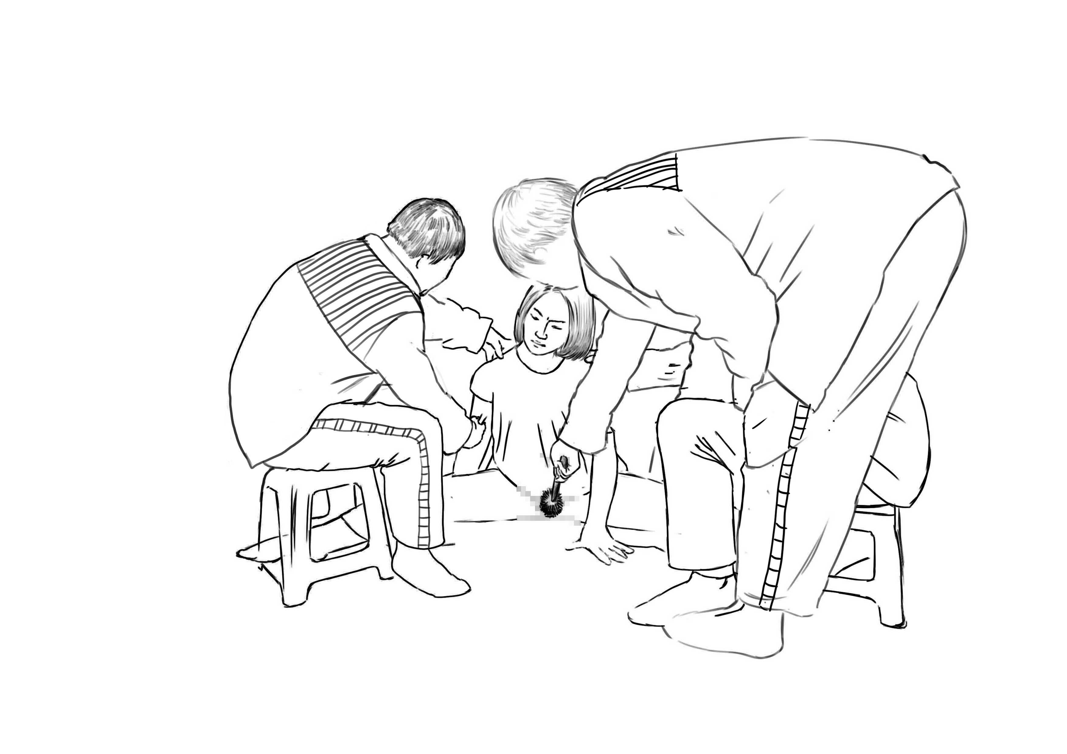 ![]() 酷刑示意图一:用鞋刷捣抹布堵嘴。 |