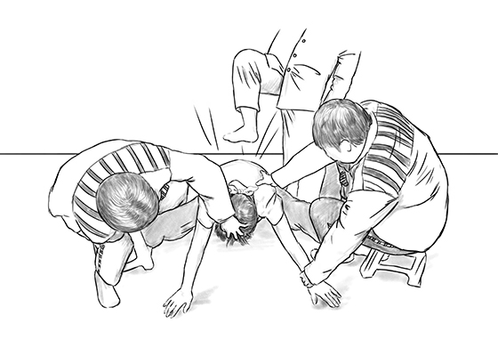 ![]() 酷刑示意图六:双腿强行一字劈开,狠跺后背脊梁。 |