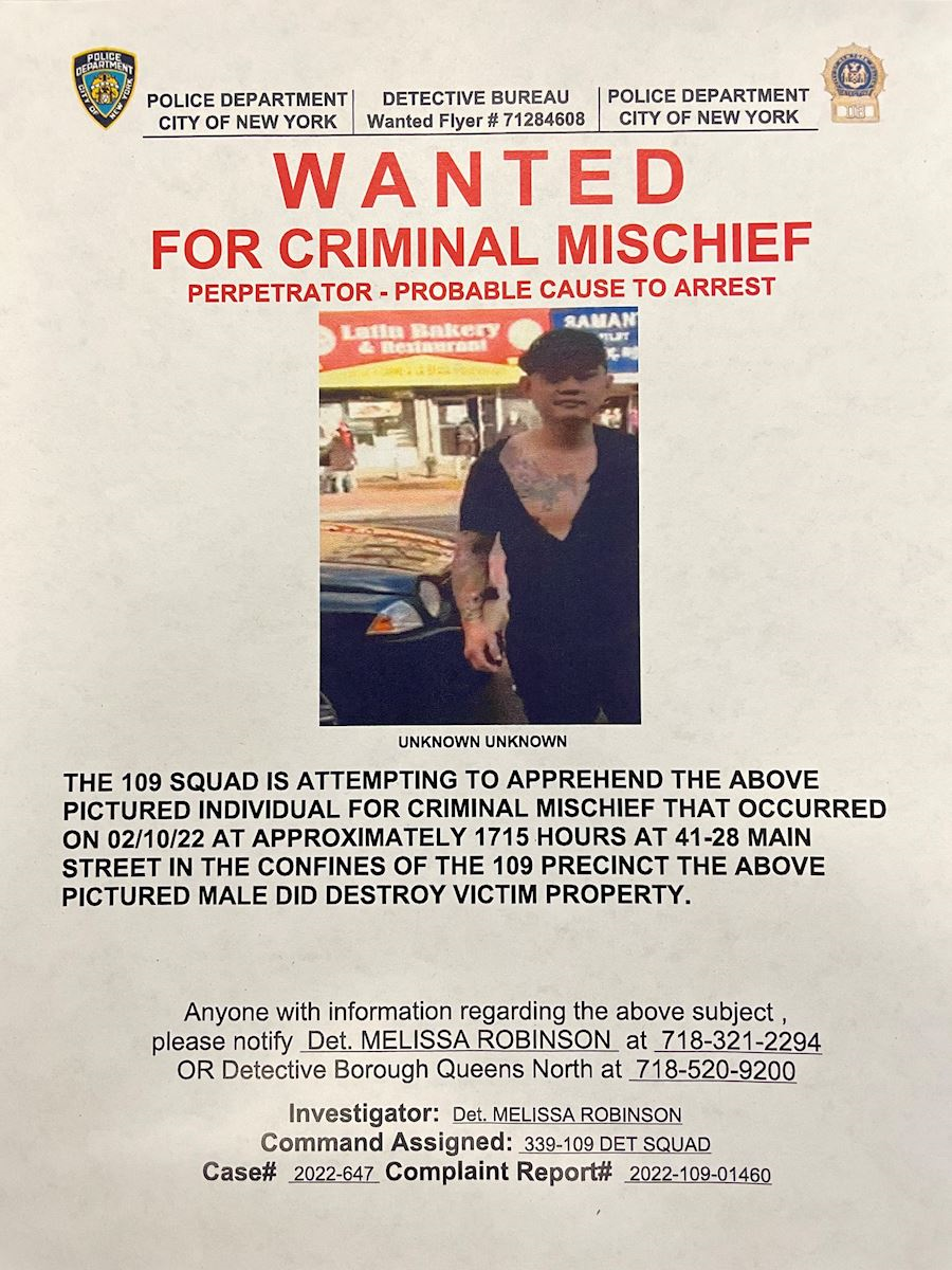![]() 图2:纽约市警方发出的通缉令,对从二零二二年二月十日以来,连续多天、多次袭击多个法轮功真相点的三十二岁嫌犯郑步秋进行通缉。(警方提供) |