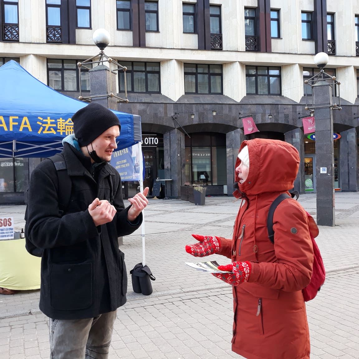 法轮功学员在老城市中心、离自由纪念碑不远之处搭起真相展位,学员们展示了五套功法。当天天气出奇的冷,尽管如此,还是有不少民众前来询问。当人们了解了法轮功修炼真、善、忍,得知中共对法轮功长达二十三年的迫害真相后,纷纷签名声援法轮功学员反迫害。