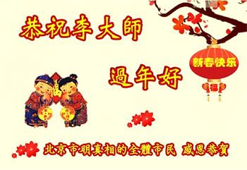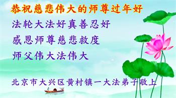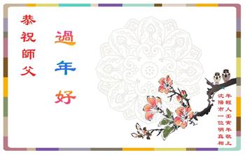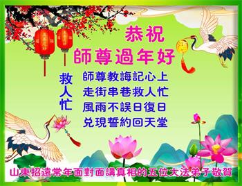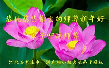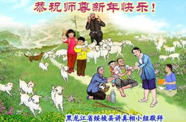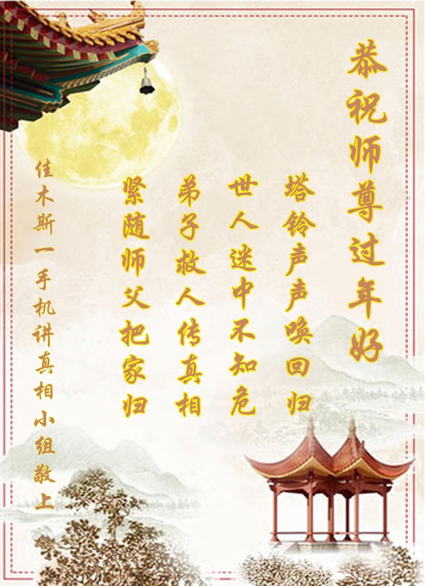 师尊您好!我们感恩师尊的慈悲保护。您牵着我们的手走过了风雨三十年!我们九名大法弟子当中有年逾八十的老同修,有七十多岁的老弟子,原本互不相识,在讲真相救人中结下了圣缘。二十年来,我们相互扶持,相互提醒走到了今天,形成了风雨无阻的面对面讲真相群组。今天我们一起给师尊拜年!请师尊放心,在这一寸光阴一寸金的最后时刻,我们一定不辜负师尊的厚望,修好自己多救人,和师父回家。