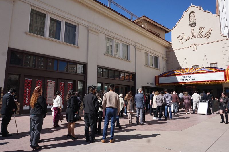 .纪.元;)'>图5:二零二二年二月五日和六日,神韵北美艺术团在德克萨斯州艾尔帕索广场剧院上演了三场演出;五日的二场演出票售罄,六日的演出是三周前增加的场次,票房已爆满。图为六日演出开演前,观众排队进场。(大.纪.元;) |