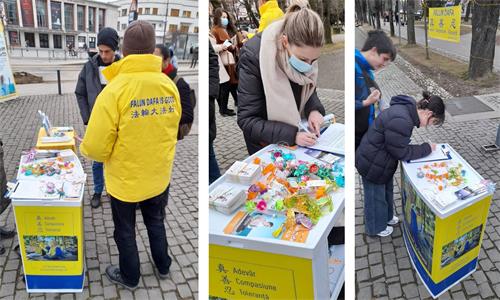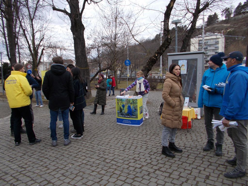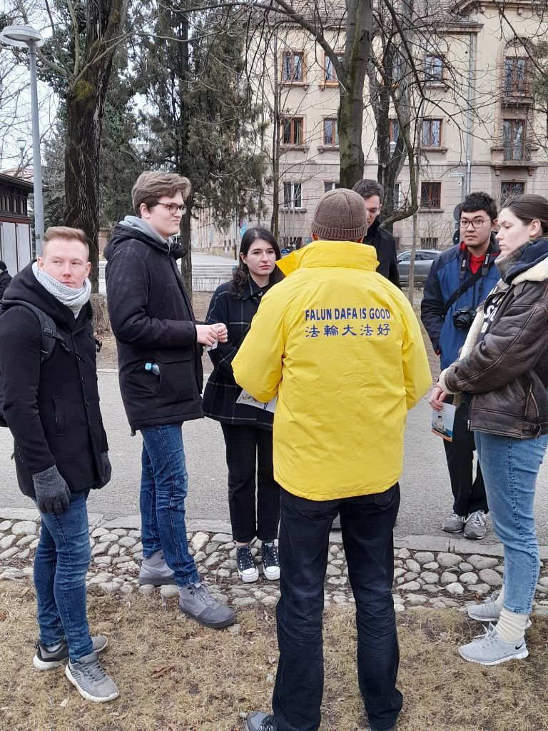 这些年轻人听后,告诉法轮功学员,他们是来自包括爱沙尼亚和保加利亚在内的几个国家的学生,他们正在罗马尼亚旅行,希望了解更多的真相。学员继续告诉他们,法轮大法的原则是真、善、忍;然而,中共自一九九九年以来,迫害法轮功学员、将他们送進监狱、劳教所,甚至活摘法轮功学员的器官。