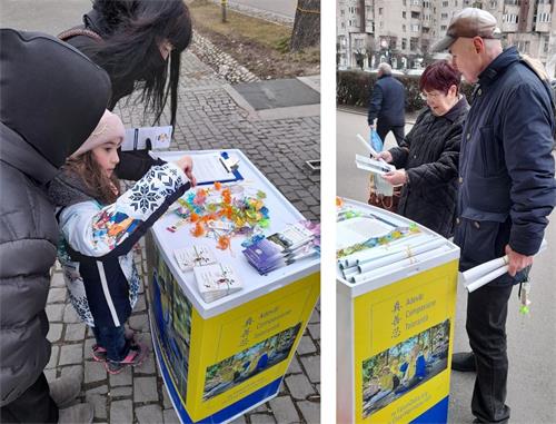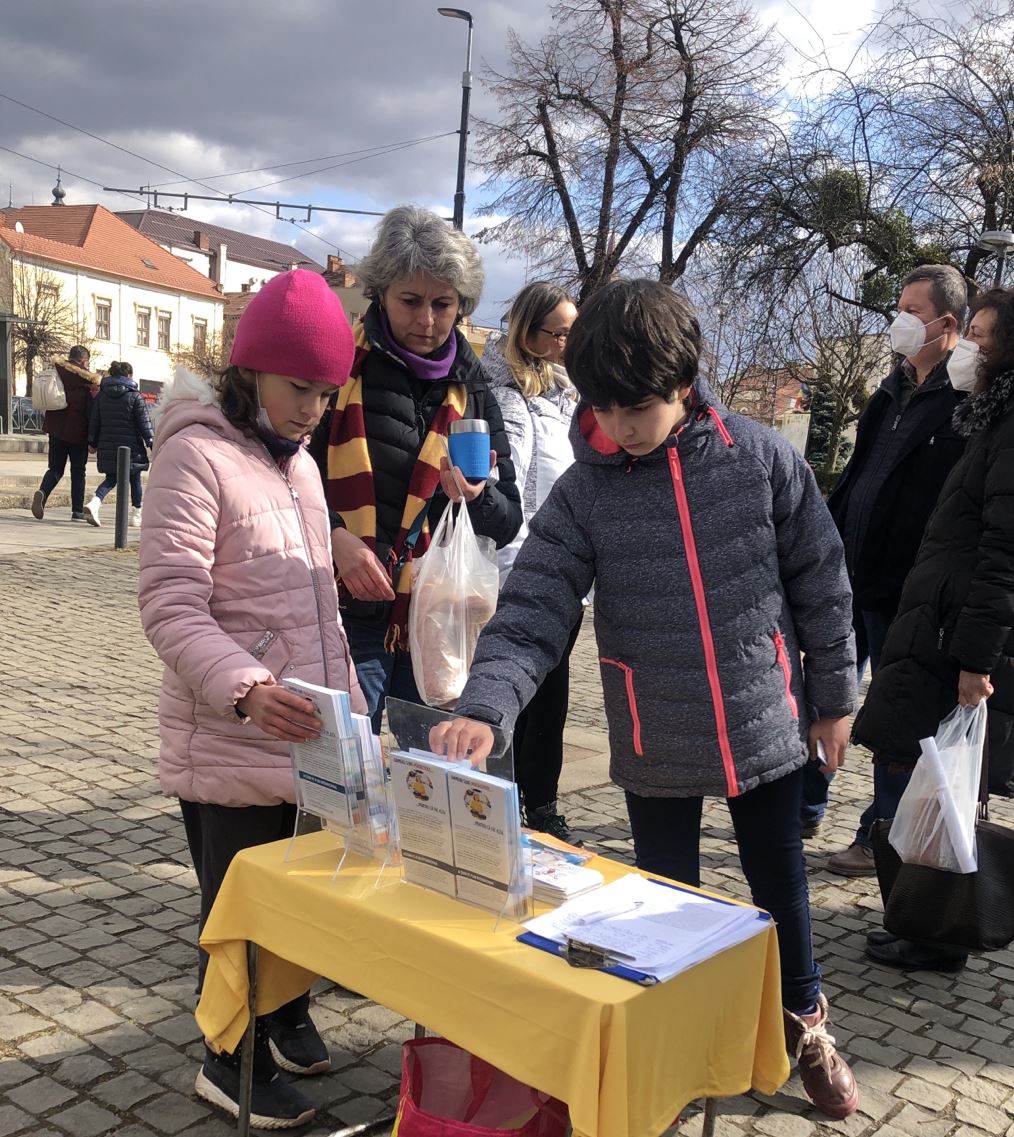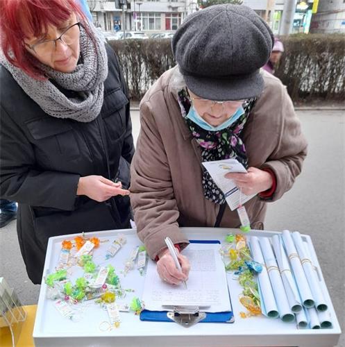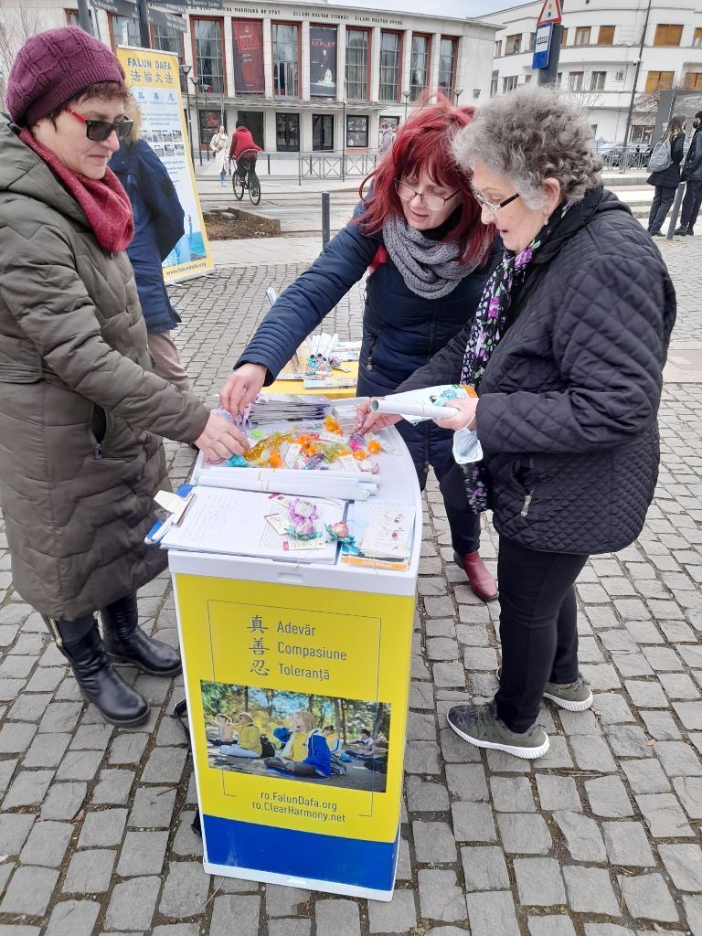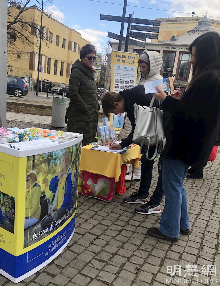 克卢日市的民众非常乐意接受真相资料,主动来了解中国发生的迫害。那些第一次听说法轮大法的人们,对在中国发生的迫害感到震惊。有些人深信中共(CCP)什么事都能干出来,他们还没有忘记罗马尼亚的共产党曾经对人民所犯下的罪行。也有一些民众表示知道法轮大法,他们很高兴收到莲花和真相资料,并在要求中共停止迫害的请愿信上签名。