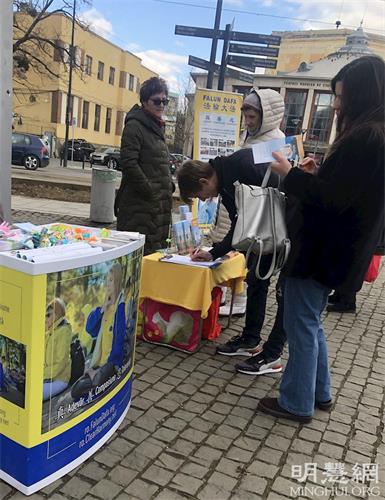 有七、八位年轻人也驻足观看,其中一人说了一些关于大法不好的话。这时候,一位学员有礼貌地答道:“你说的不是真实的,法轮大法不是邪教,而是法轮功的创始人推广于世的佛家修炼功法。”这位学员接着给了他们每人一张传单,告诉他们在www.falundafa.org网站上可以找到他们母语的法轮大法信息。不要被中共的宣传所迷惑。