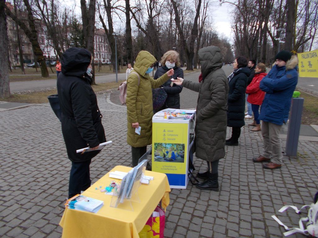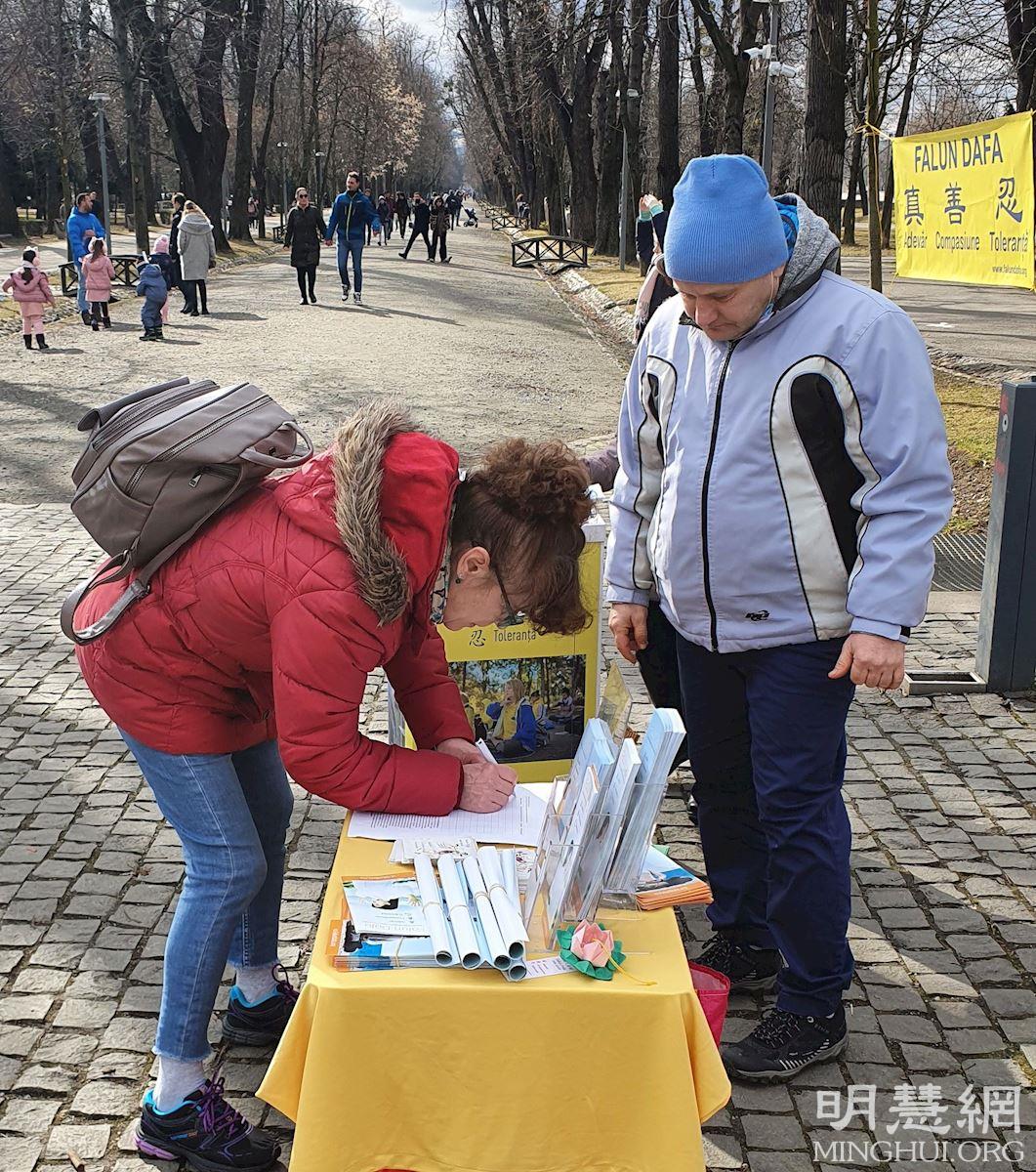 二月二十七日,在克卢日中央公园,两位女士看着法轮功学员在炼功,并表示很感兴趣。当学员告诉她们迫害还在中国发生的时候,她们询问中共迫害大法弟子的原因是什么?法轮功学员告诉她们,中国前国家主席江泽民对法轮大法非常嫉妒,一九九九年迫害开始之前,中国有上亿人修炼法轮大法。两位女士点头表示明白了。