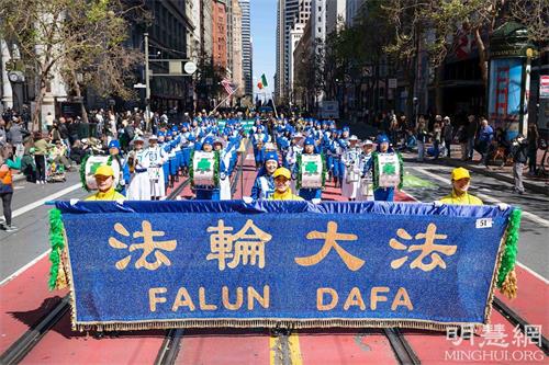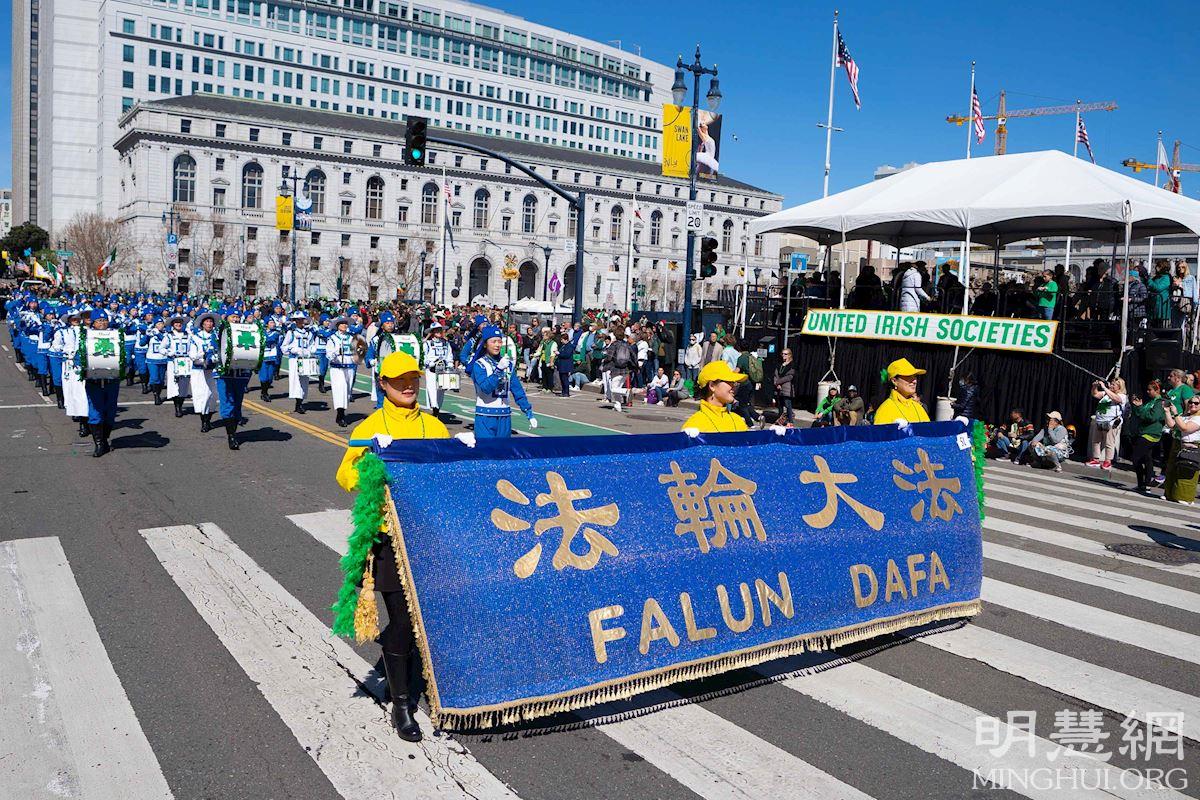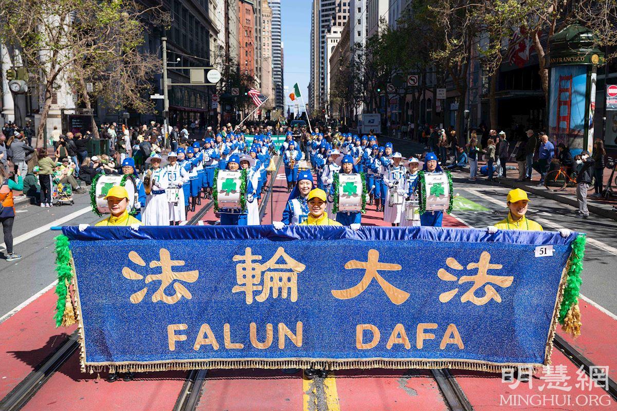 这是中共病毒大流行以来旧金山举行的首次圣派翠克日游行。当天,游行的主要街道市场街的两旁挤满了人。身着蓝白相间唐装的天国乐团,为观众演奏了《法轮大法好》、《佛恩圣乐》和《星条旗永不落》等乐曲。