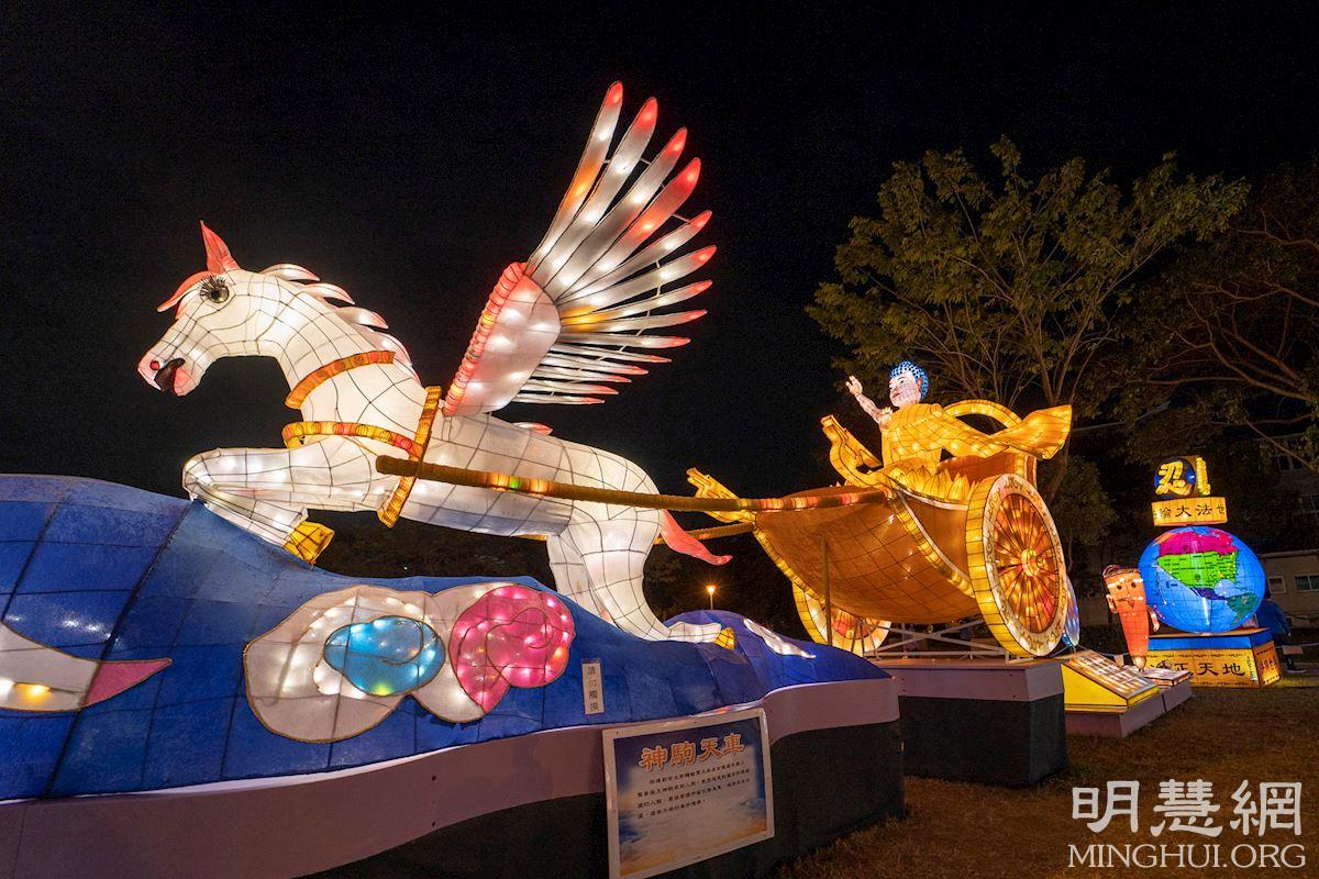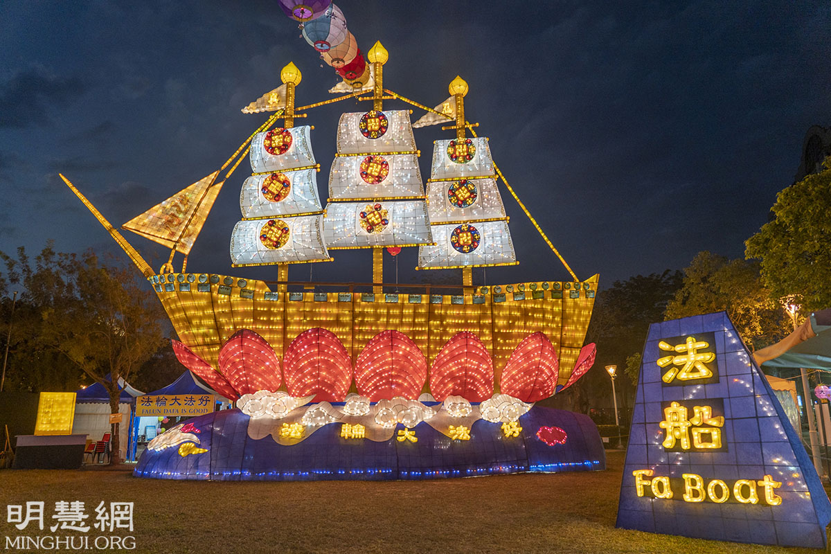 这是“法船”第十三次参加台湾灯会,设计者法轮功学员庄逸中先生提到:“这是花费半年时间制作完成的法船花灯,最下层是以十二片大莲花瓣环绕衬托,船帆上九个法轮,法轮旋转时会正转九圈、反转九圈;船头有象征吉祥的大龙旗领航;船桅上三面‘真、善、忍’令旗发出的光芒万千,在夜色中金碧辉煌,璀璨亮丽。灯区现场还布置了‘神驹天车’、‘法轮功五套功法’花灯,全天候的免费义务教功,让民众进一步了解法轮功。”