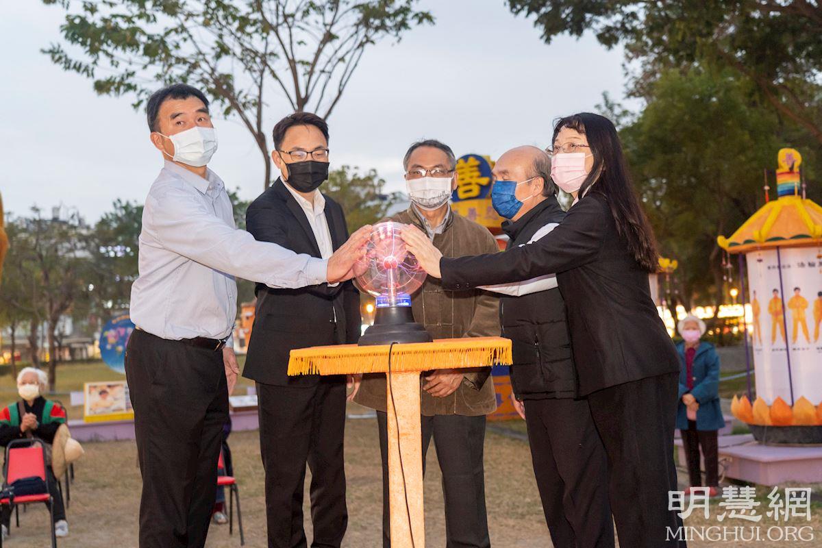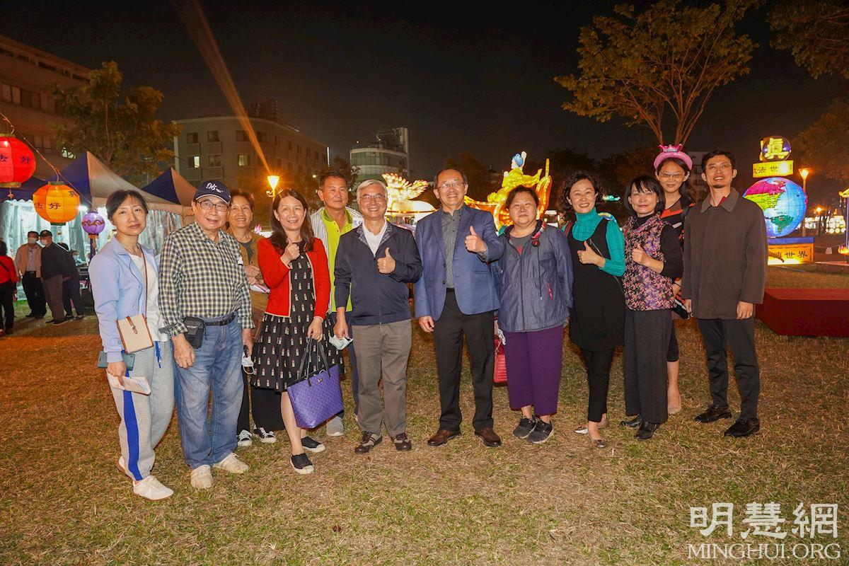 ![]() 图10:前高雄港务局港埠工程处产业工会理事长王绮华(右一)和宏海游艇执行长张嘉豪(右三),很敬佩法轮功学员用花灯的形式把法轮大法的正能量和善的力量展示出来。 |