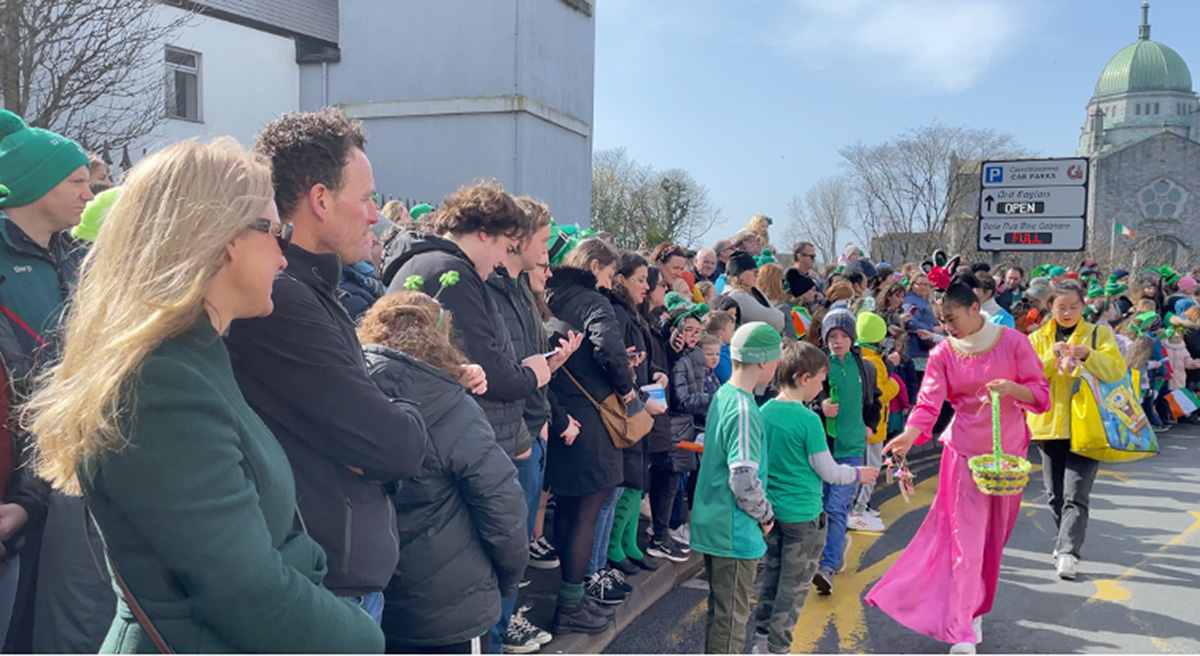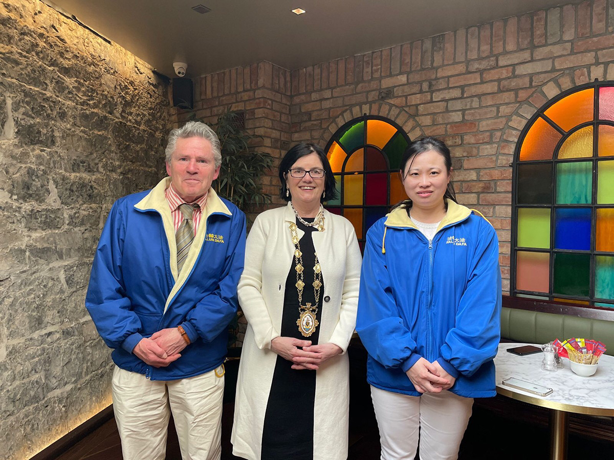 爱尔兰法轮大法学员受邀参加盛会,为观众带来法轮功功法演示、法轮功小弟子方阵和唐鼓队的表演。法轮功方阵所到之处受到热烈欢迎,掌声此起彼伏,有民众跟着学做功法动作。高威市长科莱特·康诺利(Colette Connolly)也在游行结束后和法轮功学员合影表示支持。