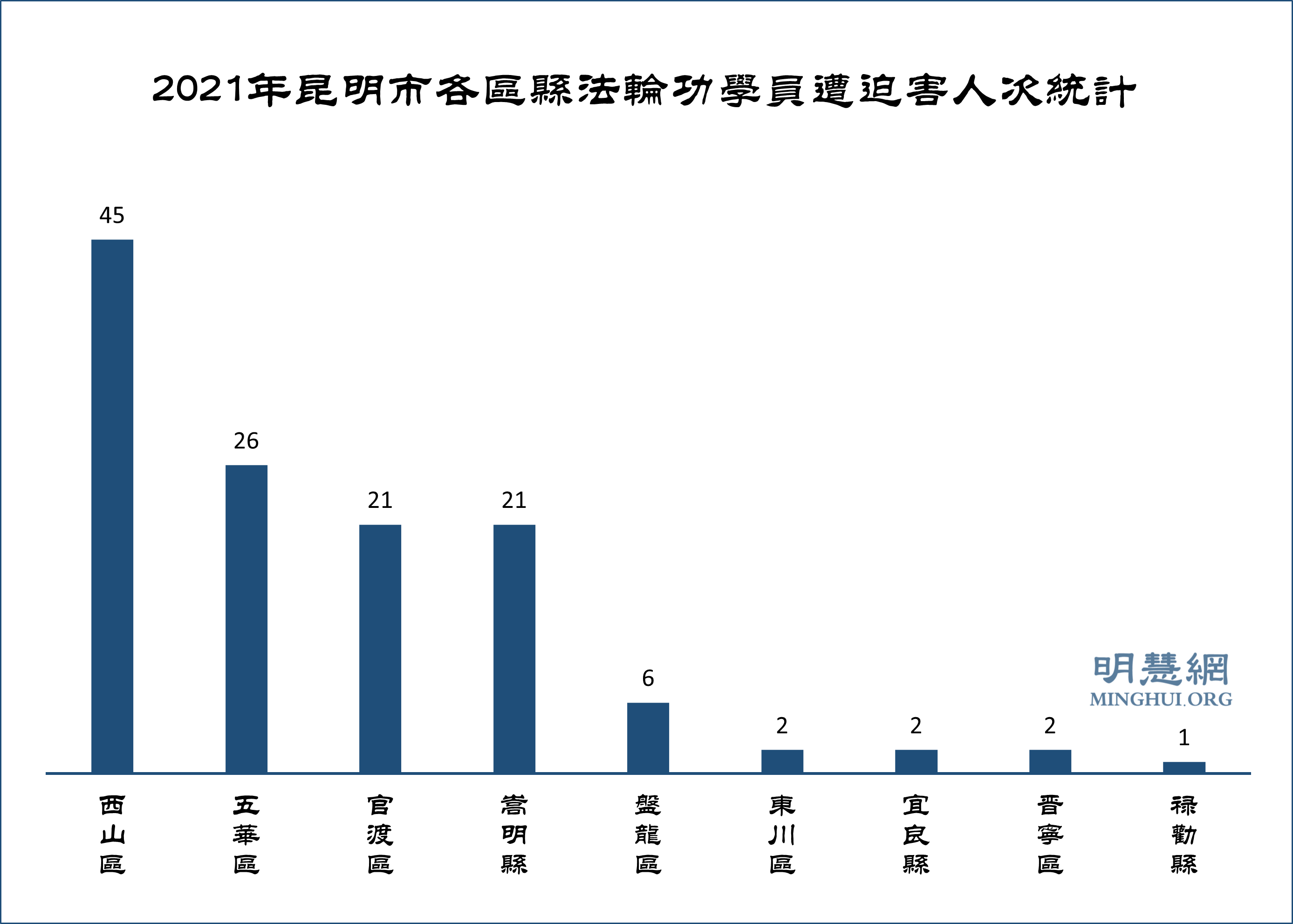 ![]() 图1:2021年获知昆明市各区县法轮功学员遭迫害人次统计 |