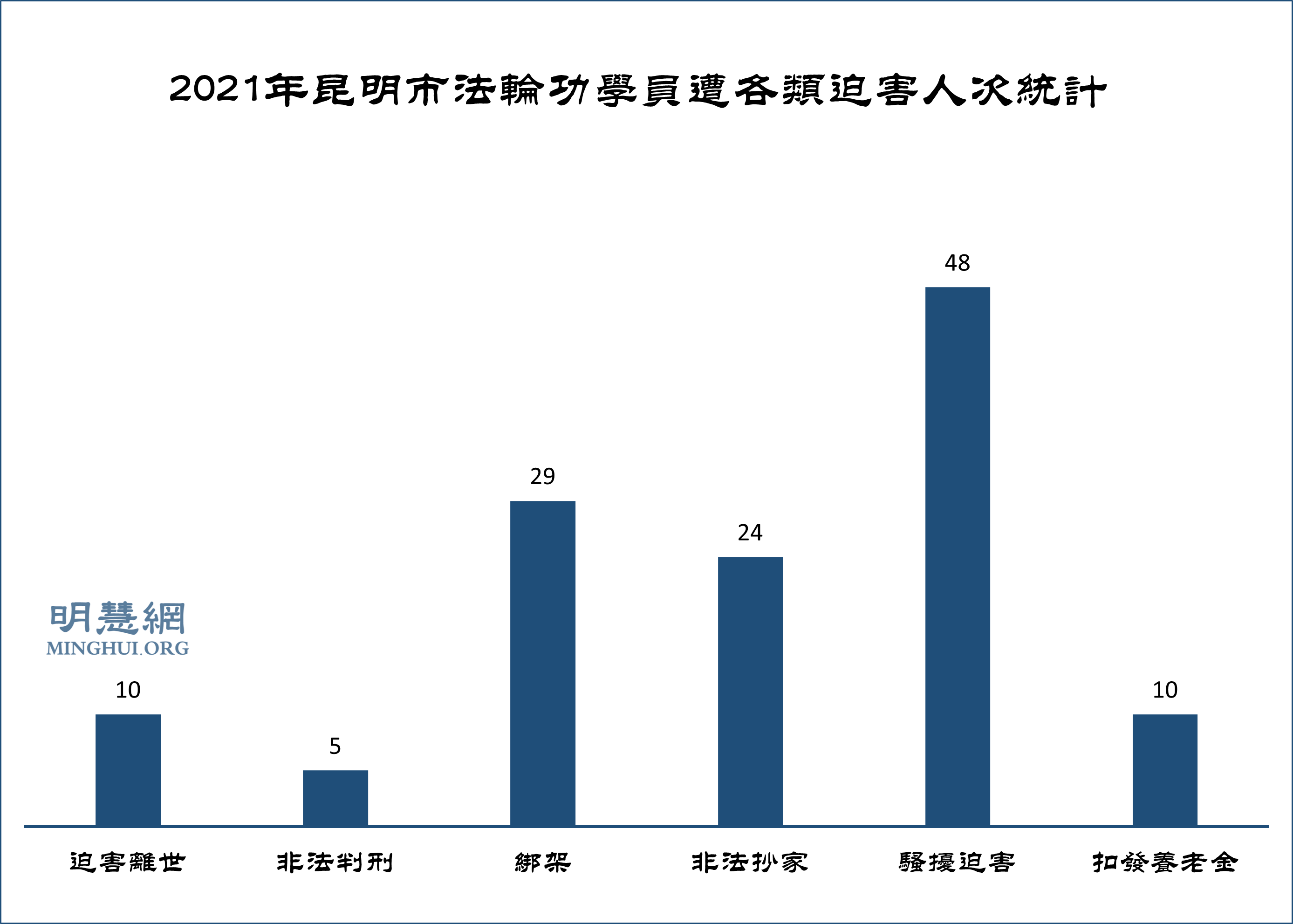 ![]() 图2:2021年获知昆明市法轮功学员遭各类迫害人次统计 |