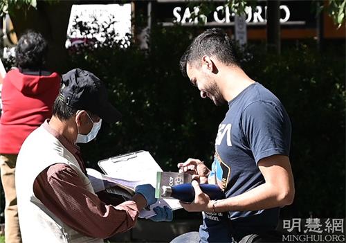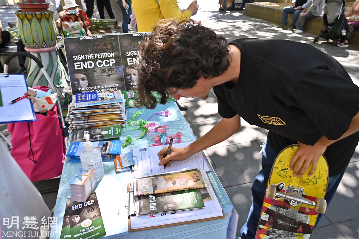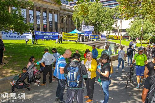 ![]() 图1-3:二零二二年三月二十六日,澳洲墨尔本市中心举行集会声援3.9亿中国勇士三:退.,图为集会现场的民众驻足观看并签名反迫害。 |