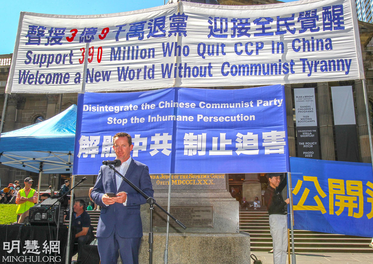 维州自由党党鞭、上议院资深议员菲恩(Bernie Finn)在发言表示,关于中国共产党的一切都是邪恶的。菲恩强调:“中共是澳大利亚的敌人,它是自由的敌人,是所有自由民众的敌人。有义务站起来,讲述真相,告诉公众,它想控制澳大利亚、控制全世界,就象控制中国百姓一样。”菲恩希望西方的民众认清中国人民和中共的区别,他还表示,能公开声援中国人退出中共、并为正确的事情挺身而出的人,是勇敢的人,因为是在为正义而战,所作所为正是人们期待善良好人做的事情。他说:“我们应该指出,揭露中共的邪恶并不是反对中国人。中国人民被踩在共产党的靴子下。他们作为受害者遭受的苦难比任何其它国家的人都多。我们对中国人民表示同情和支持。”