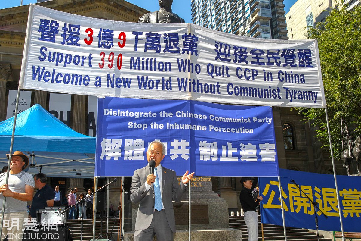 澳洲越南社区协会主席阮本(Bon Nguyen)在集会上向人们解释了中国人民和中共的区别,他说:“中国人是友善的好人,而中共是所有中国人的敌人。”许多中国人因持与政府相反的意见而被逮捕,并被剥夺人权。这种暴行甚至蔓延到国外,香港也深受其害。作为曾经的越南难民,阮本呼吁人们珍惜在澳洲的自由,并提议:“我们应该关心身在大陆、香港和台湾的人,他们是我们的同胞,而他们一直在遭受着中共的威胁。”