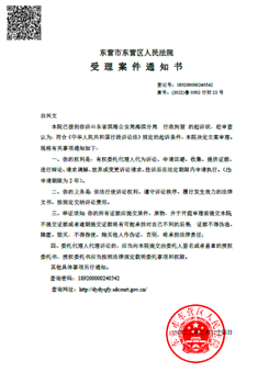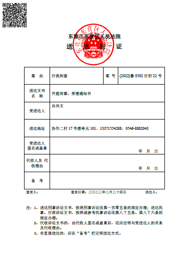 因分局警察在此过程中再次出现多处违法行为,白兴文遂于二零二二年一月十七日依法向东营市东营区法院提诉公安机关行政处罚违法。二零二二年二月二十四日,白兴文收到东营区法院的多条短信通知,告知该行政诉讼已经成功立案。