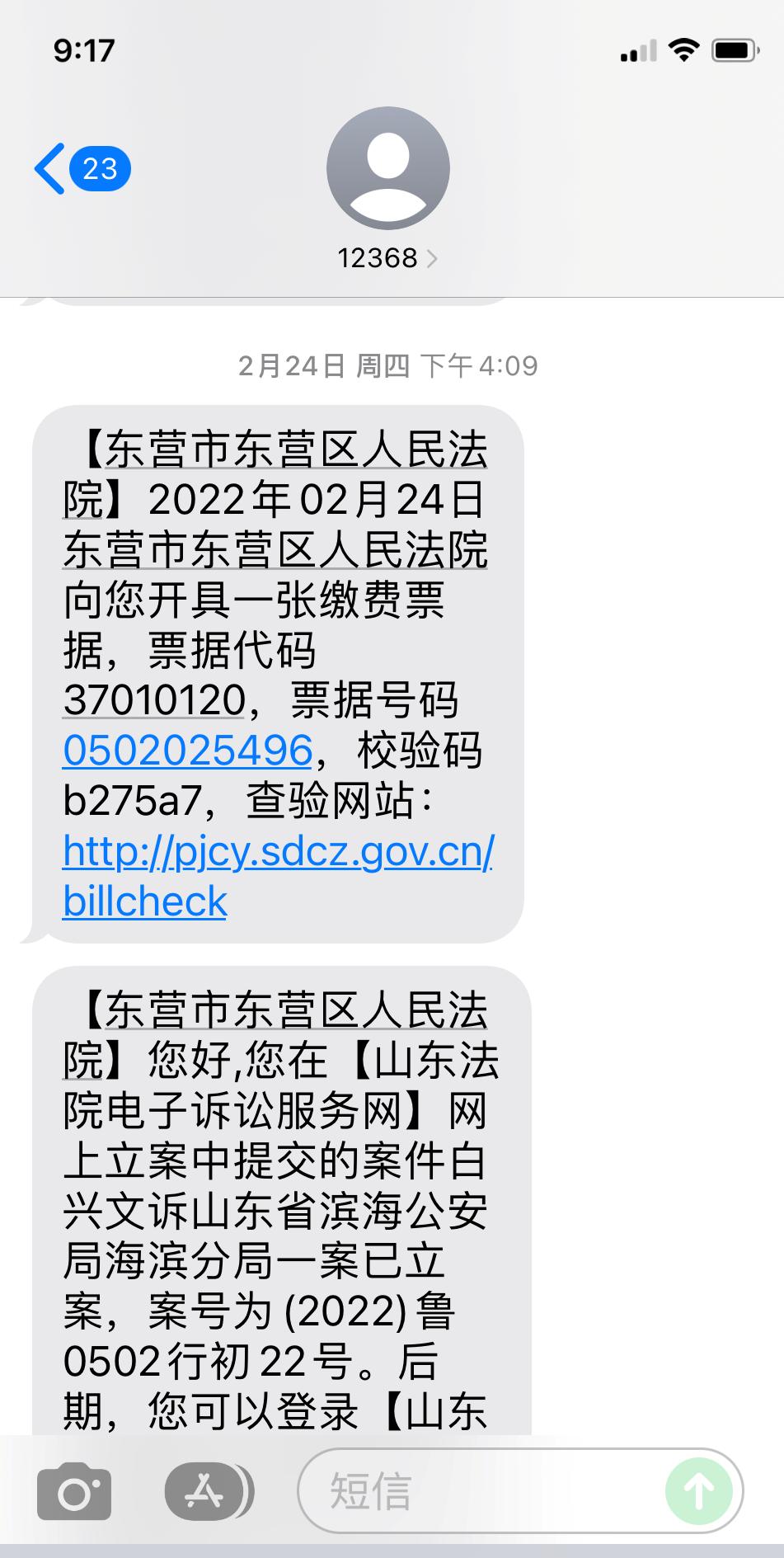 三月十八日,白兴文收到东营区法院的短信通知,内容为:“2022年3月18日东营市东营区法院向您开具一张退费票据,退费人:白兴文,票据代码0500021255,校验码9ca9a9,查验网站:https://pjcy.sdcz.gov.cn/billcheck”。