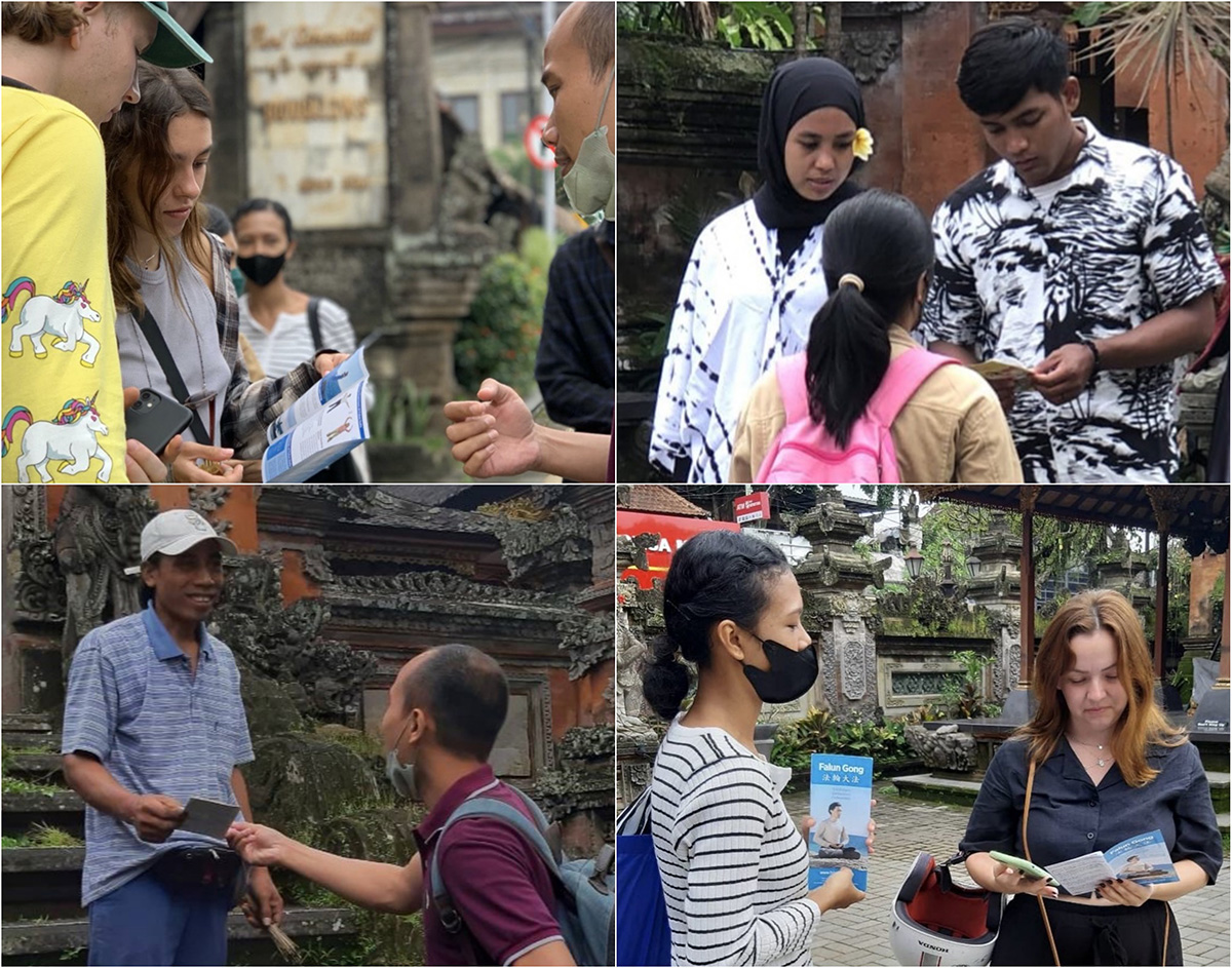 ![]() 图1:乌布皇宫(Puri Agung Ubud)的周边地区,已经成为来欣赏峇里岛传统建筑之美的游客们的最爱。青年法轮功学员们向往来的游客和当地民众介绍法轮大法。左上图中,一对来自俄罗斯和乌克兰的年轻游客聆听法轮功学员的介绍后,询问哪里可以学功。 |