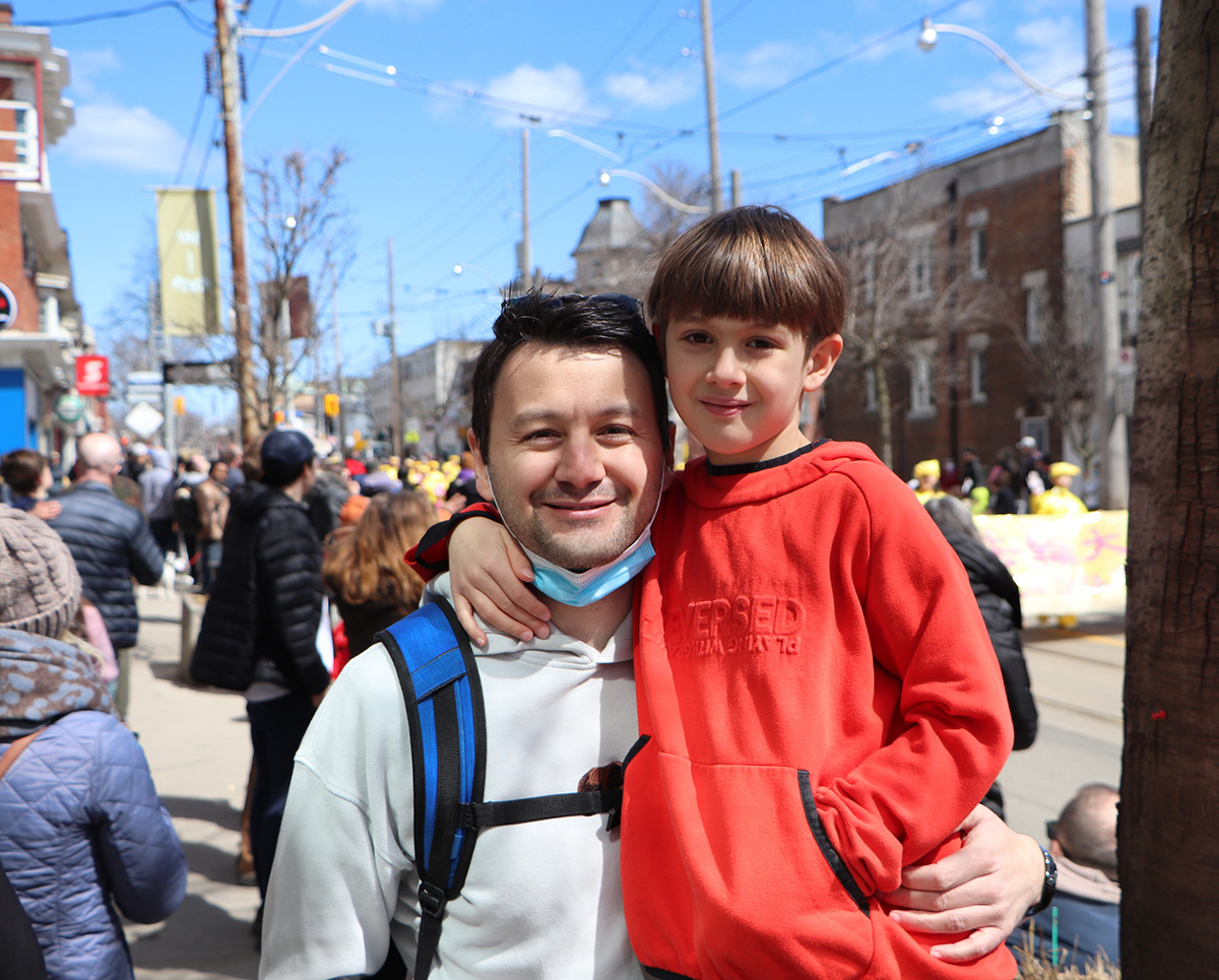 ![]() 图11:多伦多居民阿诺德(Arnold)和儿子一同观看游行,他说:“谢谢你们的到来!” |