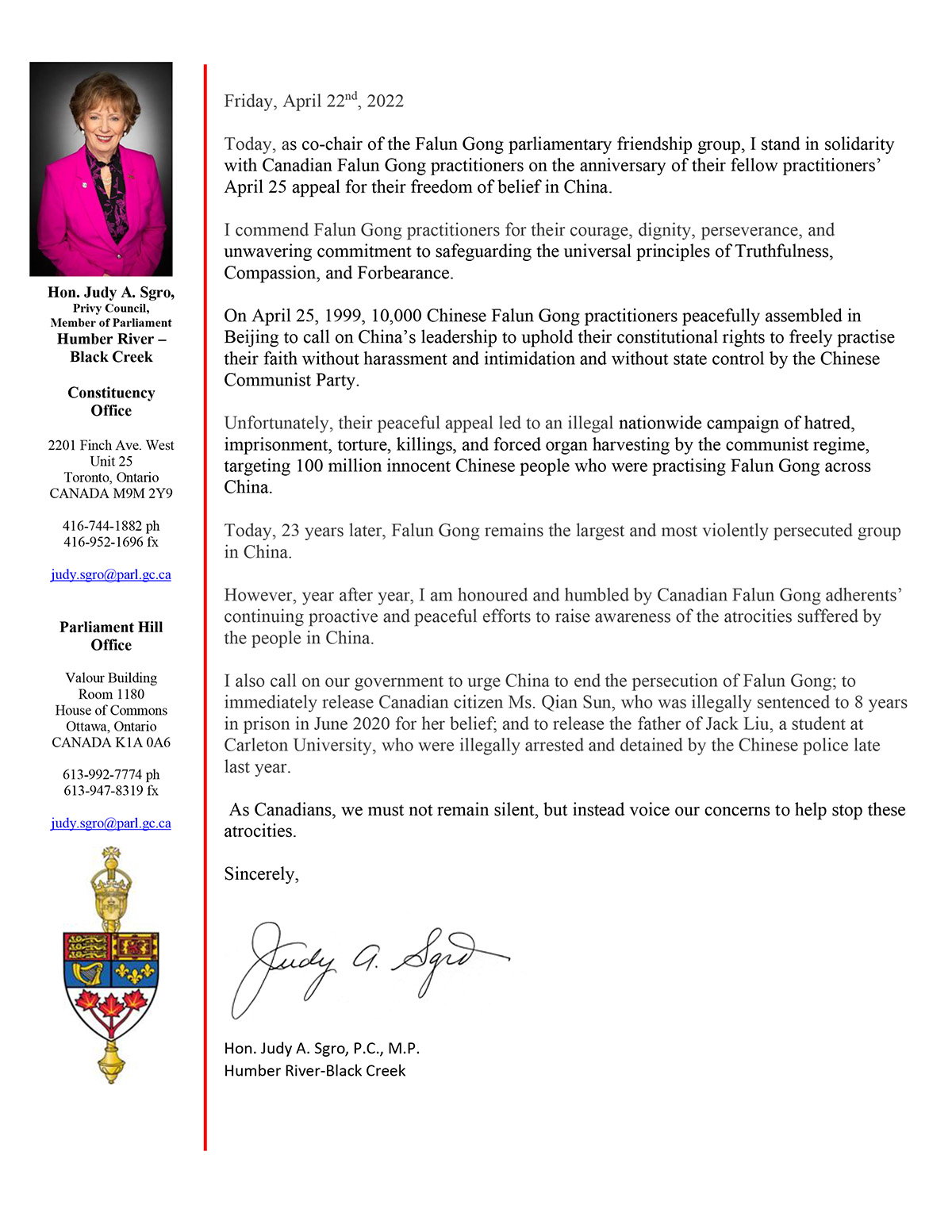 加拿大国会议员思格若(Judy Sgro)在信中说:“‘四·二五’——在中国的法轮功学员为信仰自由而呼吁的周年之际,我坚定的与加拿大法轮功修炼者站在一起,支持他们。”