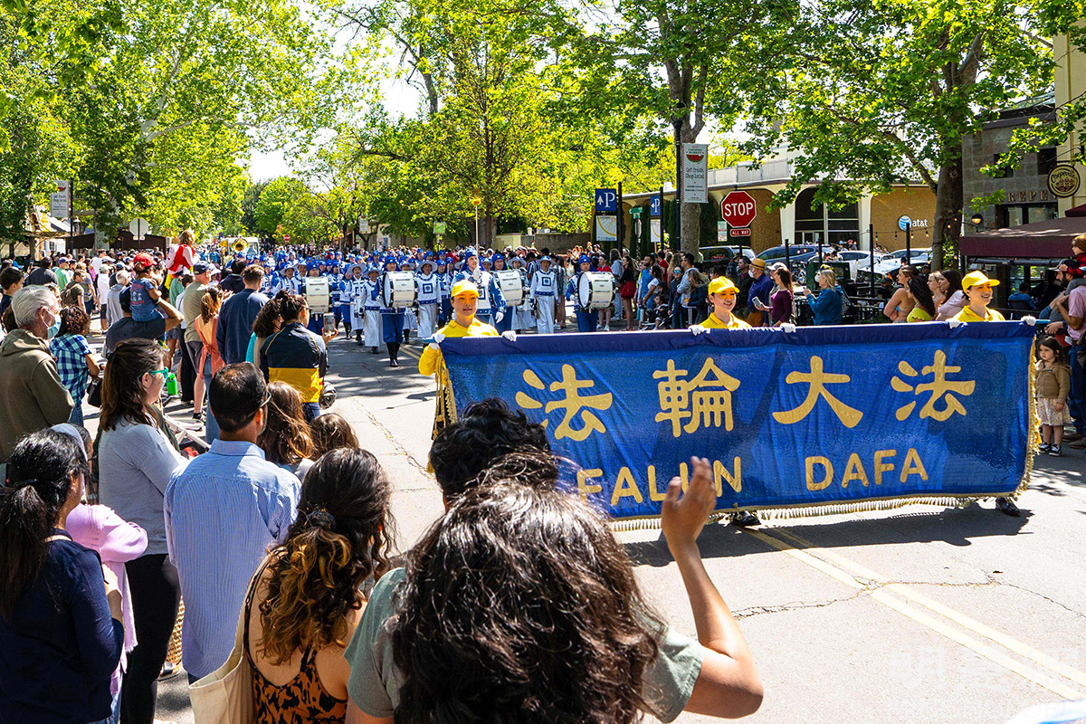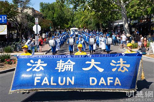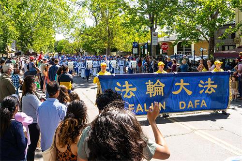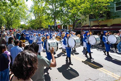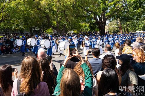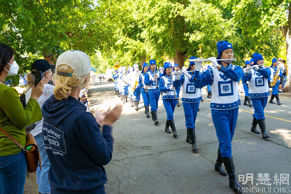 住在加州首府沙加缅度的 Lois DeMartini 看到法轮功学员的队伍,高兴地为他们鼓掌,“我非常喜欢这支队伍,太令人震憾了。”她指着自己的眼睛说,“你看,我都感动的流泪了。我不知道他们从何处而来,他们看起来非常自豪。他们正在演奏美国的乐曲,令人非常兴奋。”