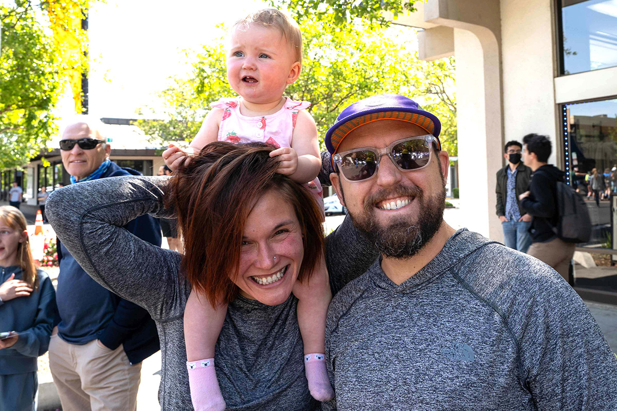 这时他们的孩子在妈妈身上鼓起掌来,他的太太 Missy 说,“我的女儿 Grace 也喜欢这支队伍。他们真的很棒,我非常高兴他们来这里参加游行。”当他们了解到这支队伍中有八十多岁的团员,也有十几岁的团员时,Matt 吃惊地表示,“哇,这真是太好了。我希望观众们都喜欢这支队伍。”