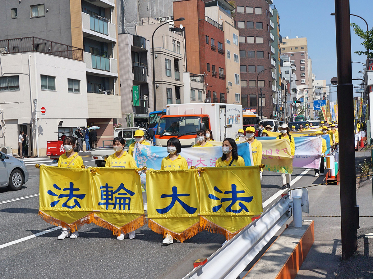 下午一点三十分,游行队伍从浅草的花川户公园出发,数百名法轮功学员举着各色彩旗沿着街道缓缓前行。“真、善、忍”、“法轮大法好”、“法轮大法洪传100多个国家”、“天灭中共”、“中共≠中国”、“控告江泽民”、“停止活摘器官”等横幅和彩旗在游行队伍中飘扬。
