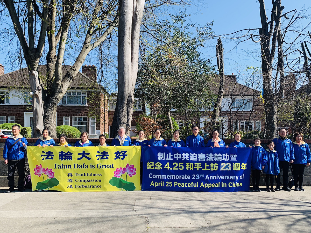 ![]() 图1~2:二零二二年四月二十日,爱尔兰部分法轮功学员来到中共大使馆门前举行活动,纪念“四·二五”万人上访23周年。 |