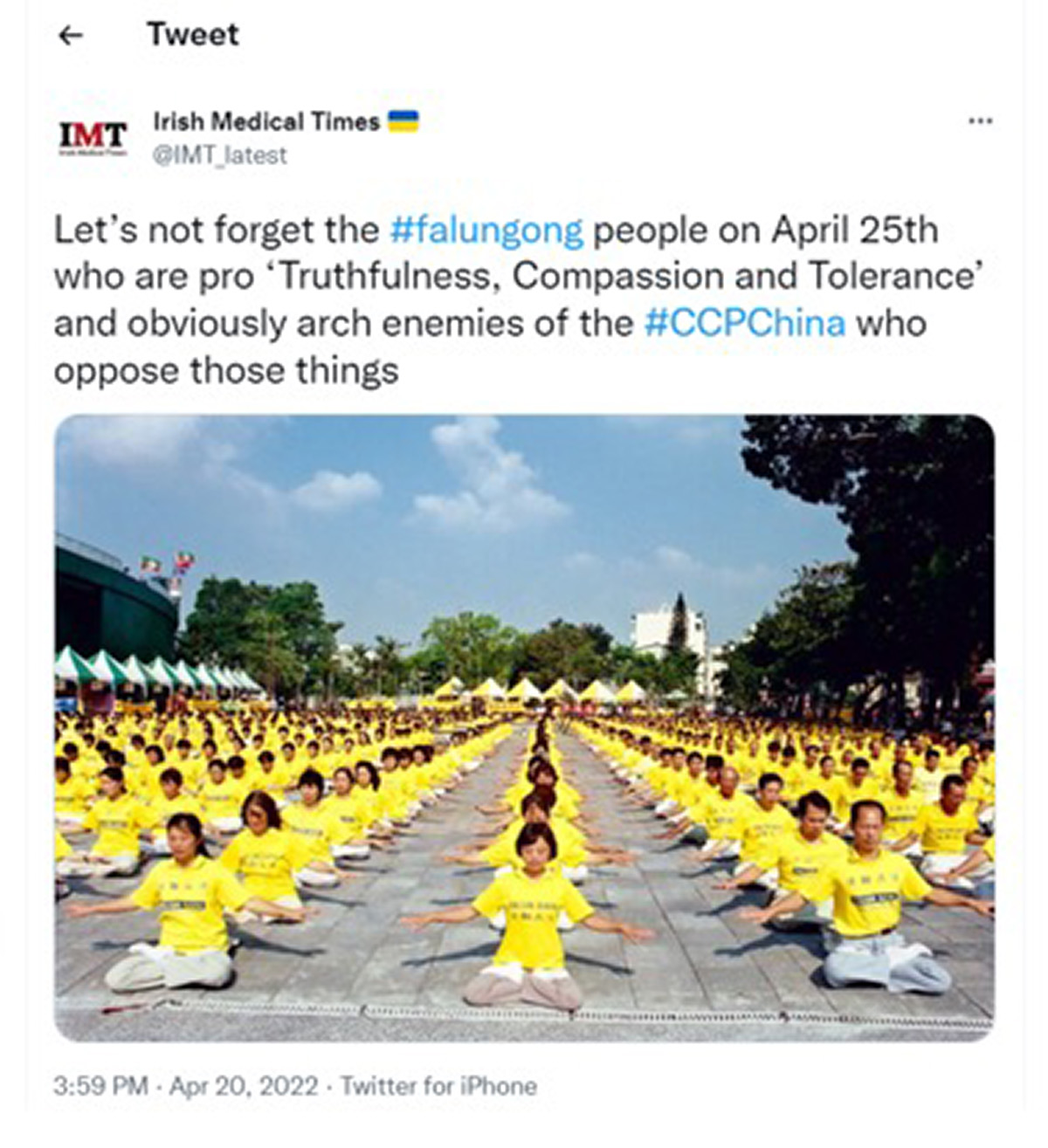 ![]() 图3:《爱尔兰医疗时报》二零二二年四月二十日在推特上发布法轮功学员“四·二五”活动公告 (网络截图) |