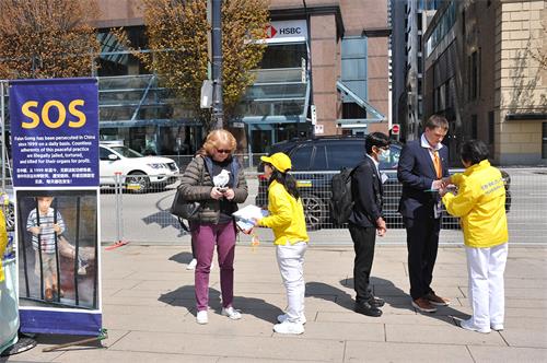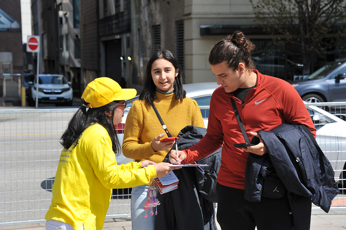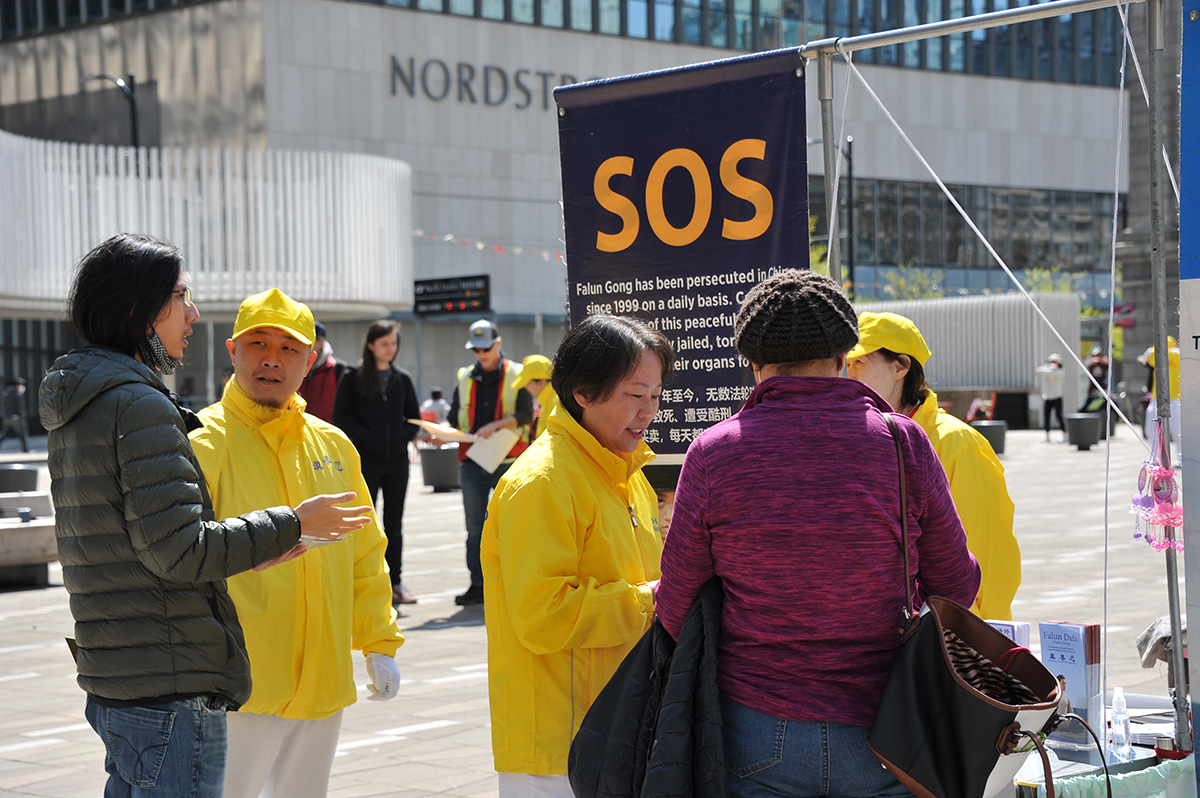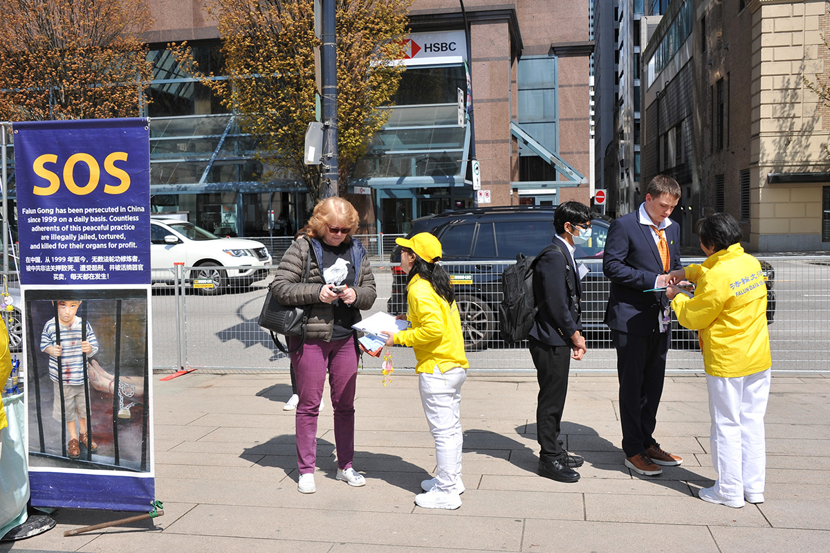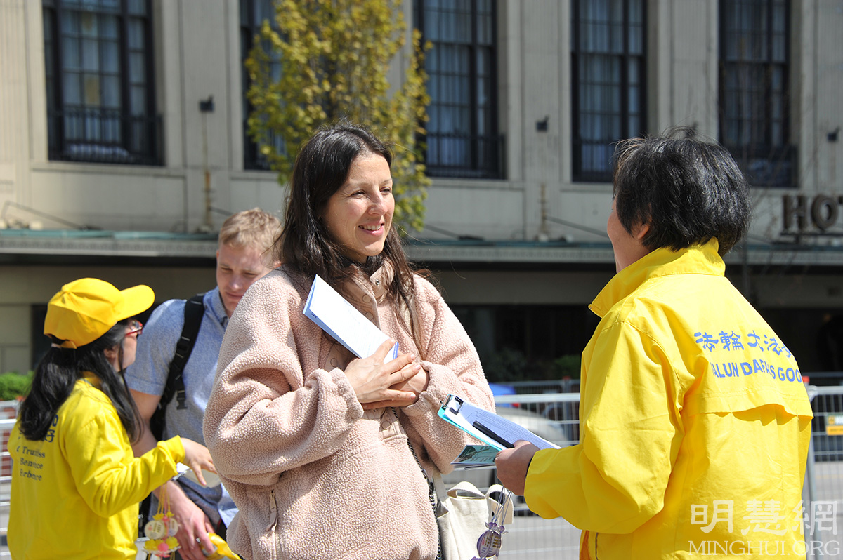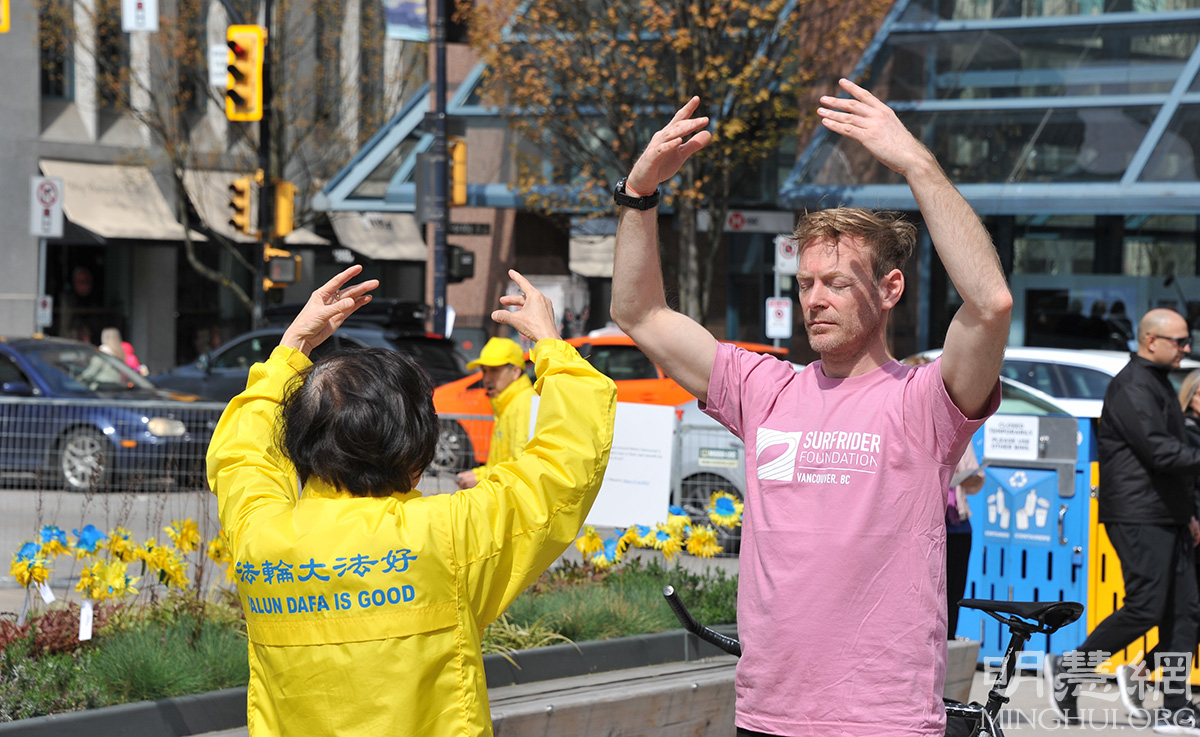![]() 图3:四月二十三日很多路人被法轮功学员的集体炼功的场面所吸引,还有一些想要亲身体验炼习功法的美好。 |