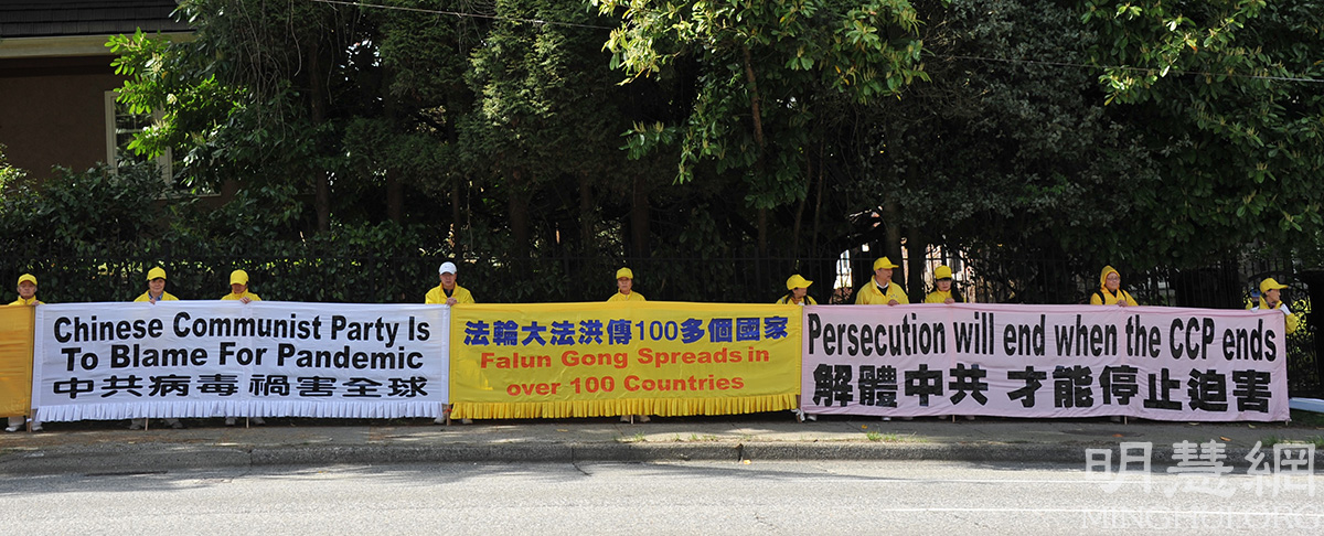 ![]() 图8~9:二零二二年四月二十四日,温哥华部分法轮功学员在中领馆前集会纪念“四·二五”和平上访二十三周年。 |