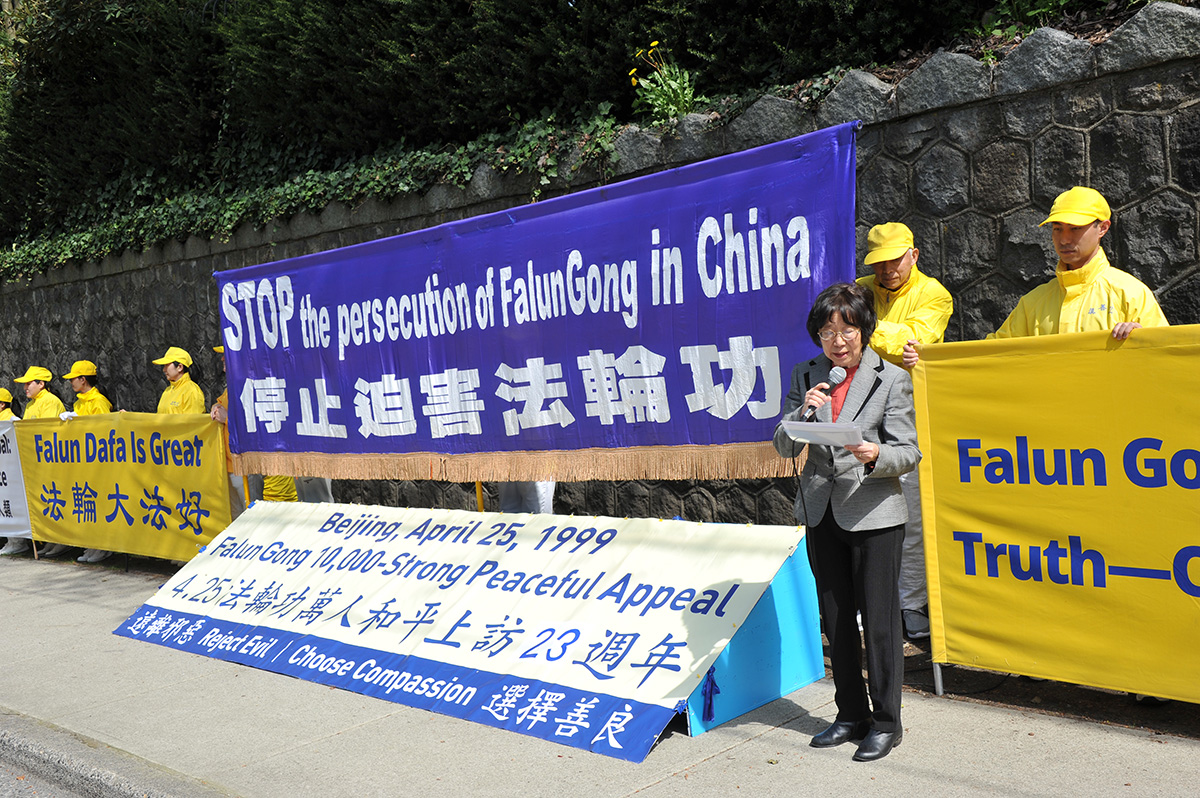 四月二十四日下午,张素代表温哥华法轮大法学会在中领馆前的集会活动中发言说,以真、善、忍为修炼准则的法轮功,因为对中国社会民生的显著贡献,在中共迫害法轮功之前曾获得了中国当局的支持、表彰和官方背书。