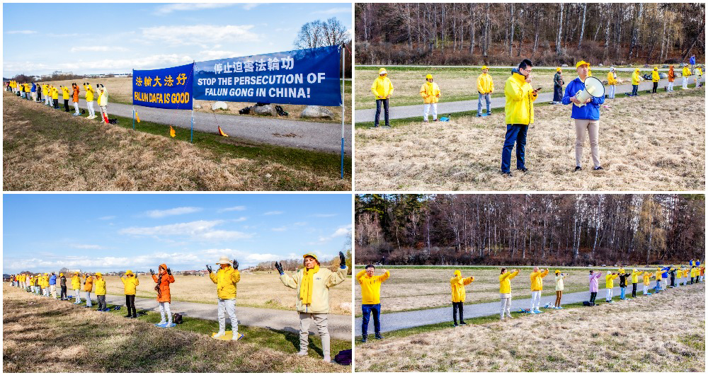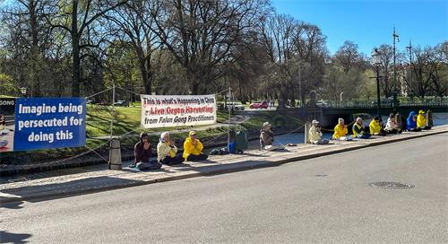 四月二十三日上午九点,瑞典部份法轮功学员在斯德哥尔摩中使馆对面的草坪上,伴随着炼功音乐展示法轮功的五套功法,同时通过扬声器向中共驻瑞典大使及中使馆内的工作人员宣读劝善信,奉劝中国同胞们都能辨别是非善恶,远离中共这个邪恶组织。为了自己和家人选择一个美好的未来,同时向过往民众揭露中共迫害法轮功,活摘器官的罪行。