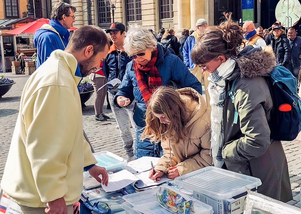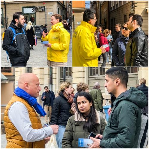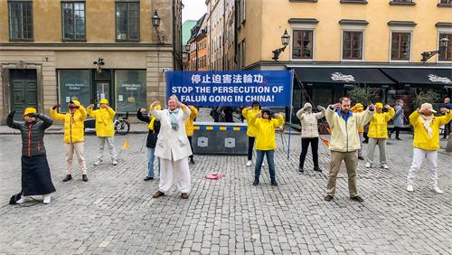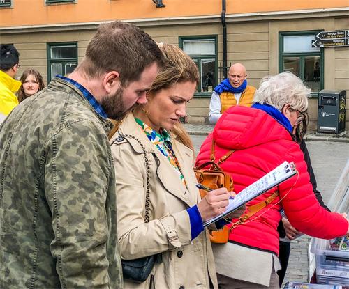 当天下午一点,学员们又来到斯德哥尔摩市中心诺贝尔博物馆旁以集体炼功,摆放真相展板和征集签名等形式,向当地民众和游客讲述法轮功学员“四·二五”和平理性上访,反映情况,换来的却是近二十三年的血腥迫害,甚至被活摘器官的真实真相,明白了真相人们纷纷签名支持法轮功反迫害。