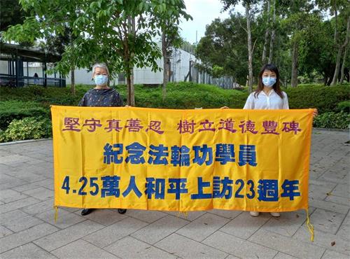 在二零二零年前每年“四·二五”香港法轮功学员都会发起游行、集会等活动。今年因应港府的“四人限聚令”,部分法轮功学员仍以二至四人一组的方式举行纪念活动。他们展示的横幅写着“纪念法轮功学员4.25万人和平上访23周年”,“坚守真善忍 树立道德丰碑”。