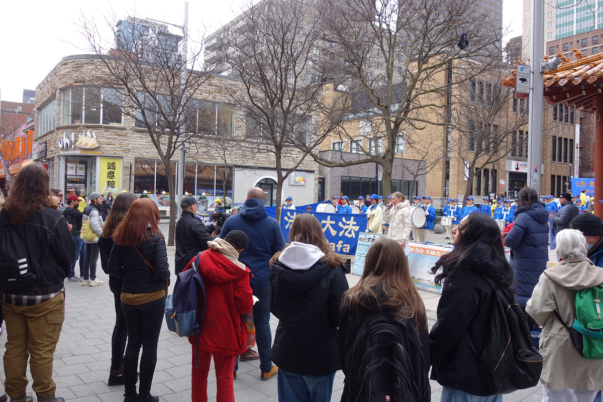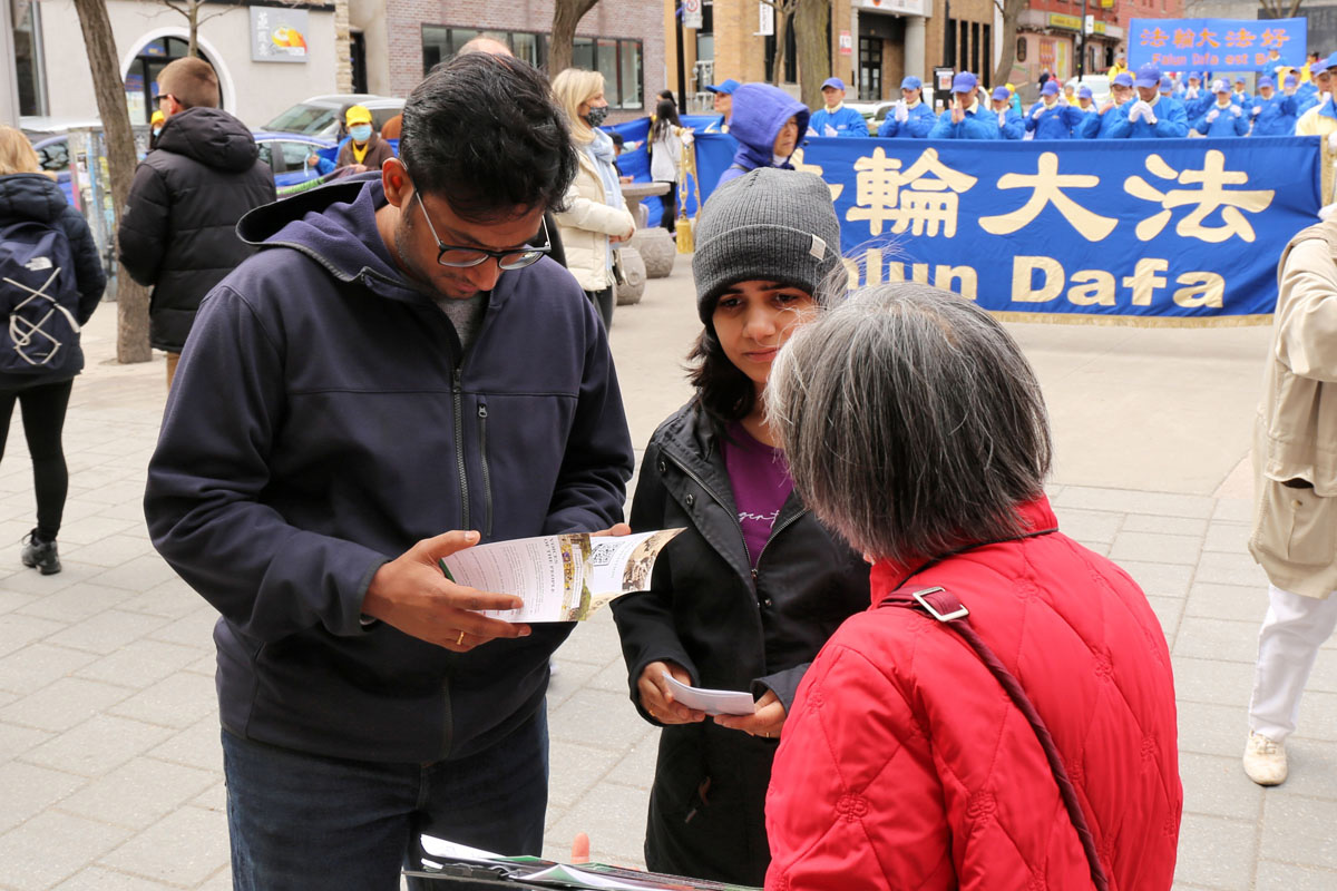 图4~6:二零二二年四月二十四日,加拿大魁北克部分法轮功学员在蒙特利尔唐人街,集会纪念“四·二五”和平上访二十三周年。民众前来了解真相。 |