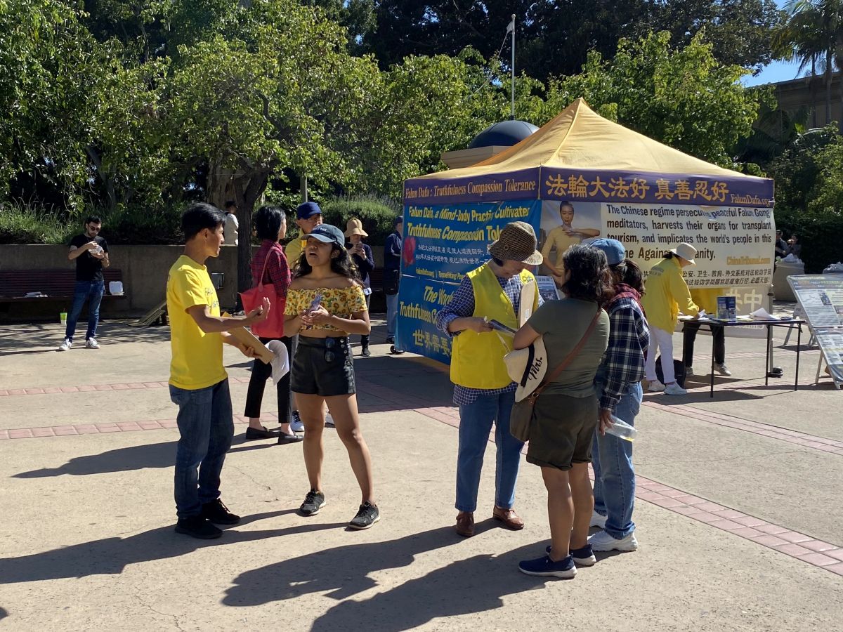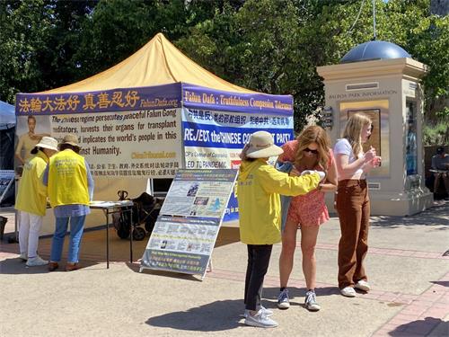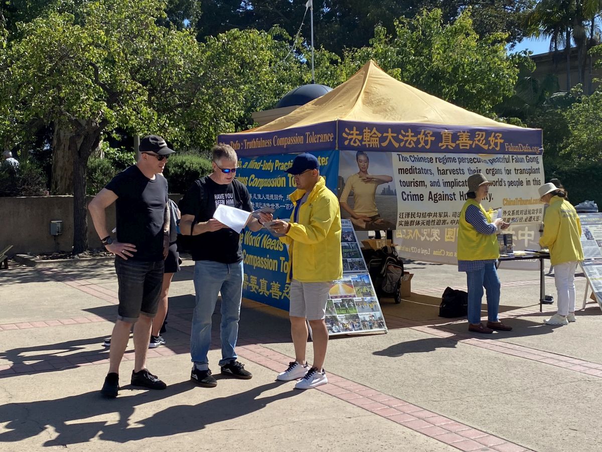 当天的巴博亚公园(Balboa Park)和中途岛航母博物馆(USS Midway)景点游人如织。“法轮功4.25请愿 和平理性 道德丰碑”、“法轮大法好 真善忍好”、“中共对法轮功的迫害手段正在伤害所有人”和“制止中共活摘器官”等横幅和图片吸引了不少人驻足观看。