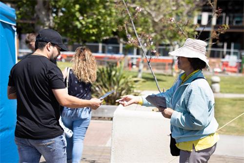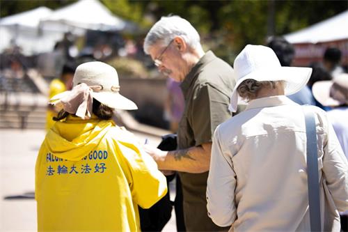 一名男士,在当地经营一家太阳能公司,他主动来签名并说:“我了解法轮功,知道你们在做什么,这很重要。我们现在必须制止中共的恶行,否则我们的国家就没有未来了。”