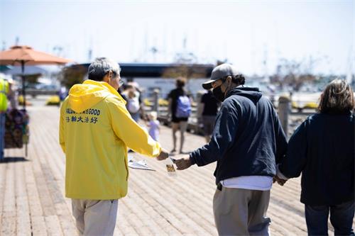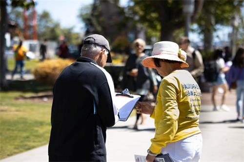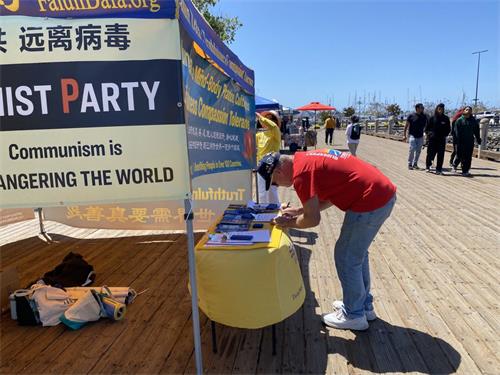 中国民主党洛杉矶分部主席葛坤,在圣地亚哥巴博亚公园遇到了法轮功学员的真相展位。